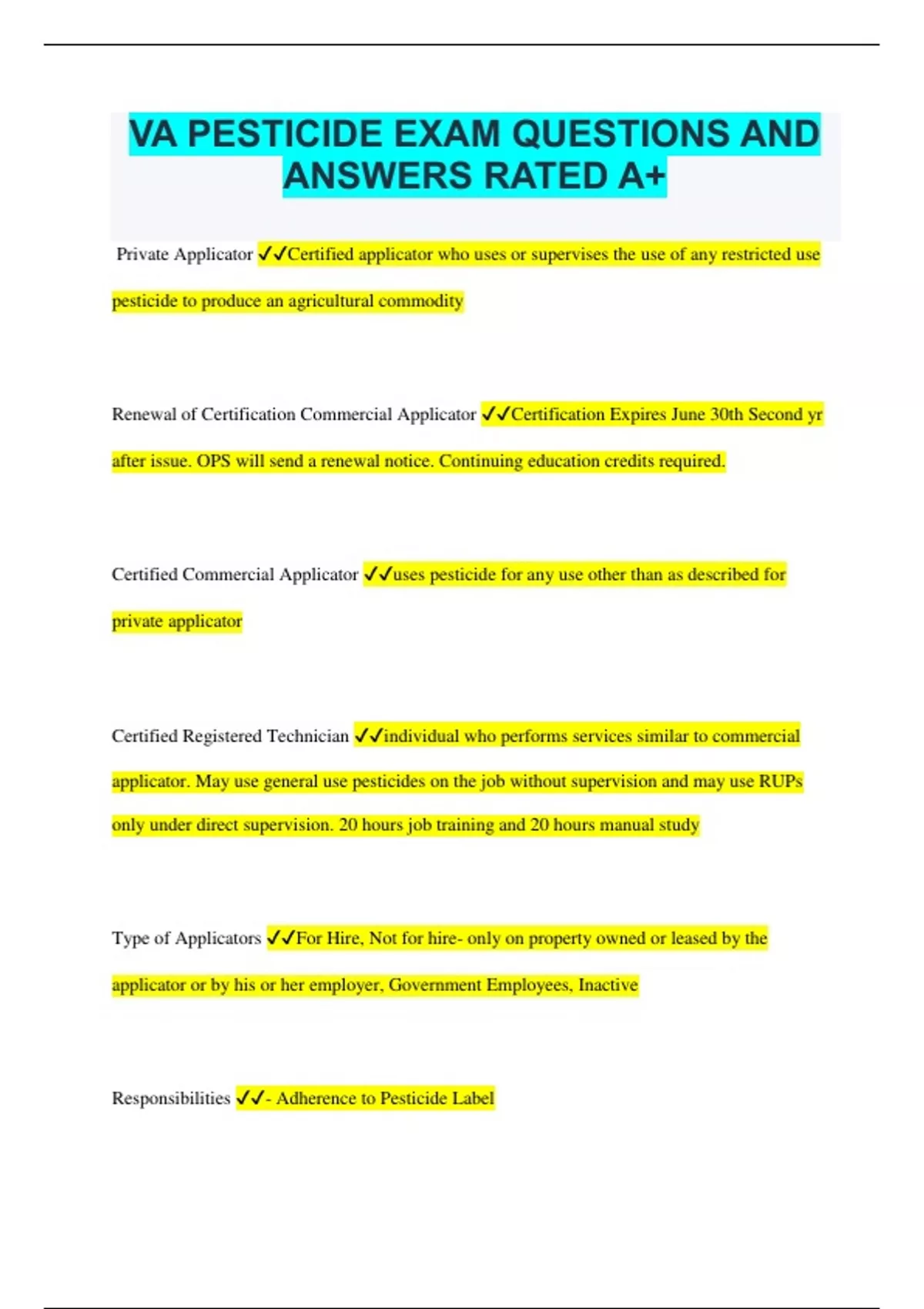 Virginia Pesticide Bundled Exams Questions and Answers Multiple Versions (2024/2025) (Complete and Accurate)