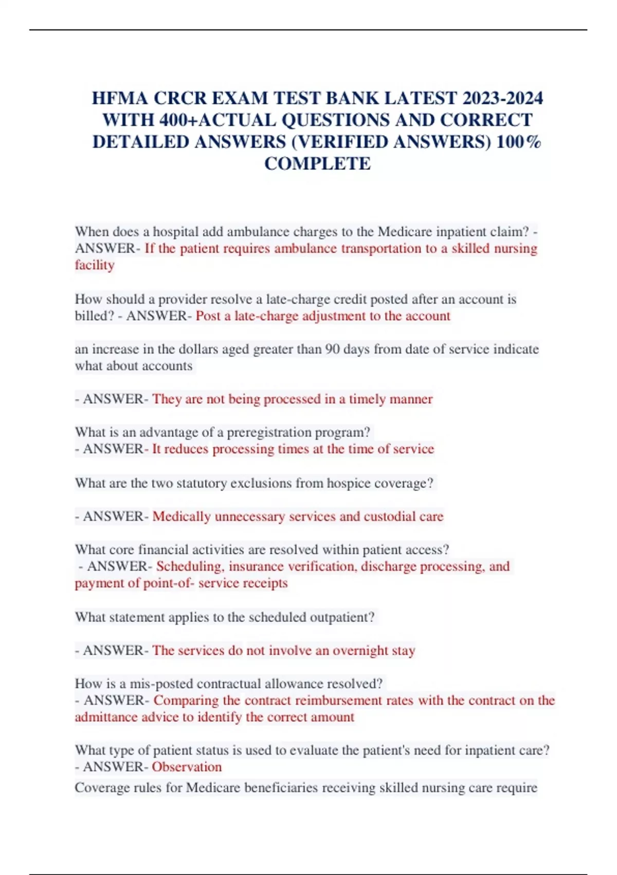 PACKAGE DEAL FOR HFMA CRCR EXAMS 2023& 2024/ACTUAL EXAMS WITH 1000+ QUESTIONS AND CORRRECT DETAILED ANSWERS/NEWEST UPDATE/A+ GRADE