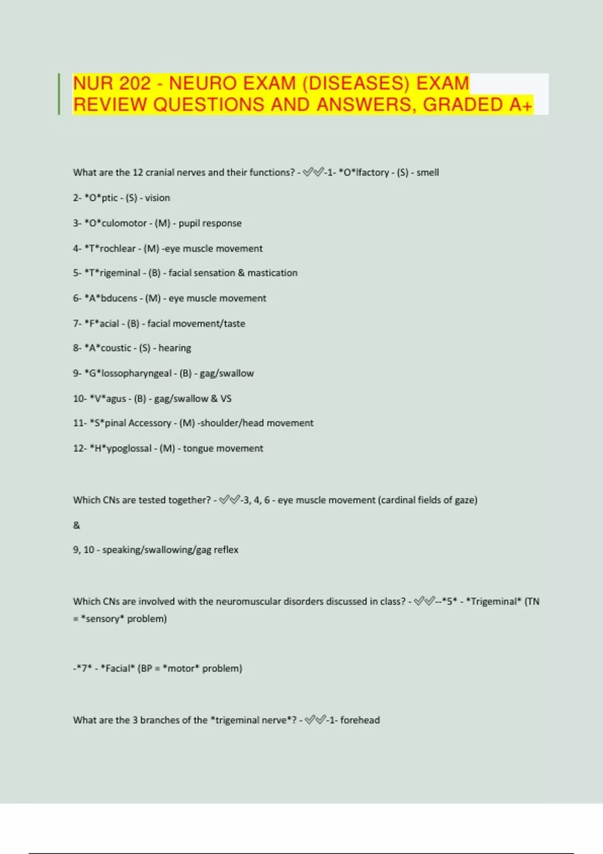 NUR 202 - NEURO EXAM (DISEASES) EXAM REVIEW QUESTIONS AND A| LATEST UPDATES 2024/25 APPROVED| NSWERS, GRADED A+