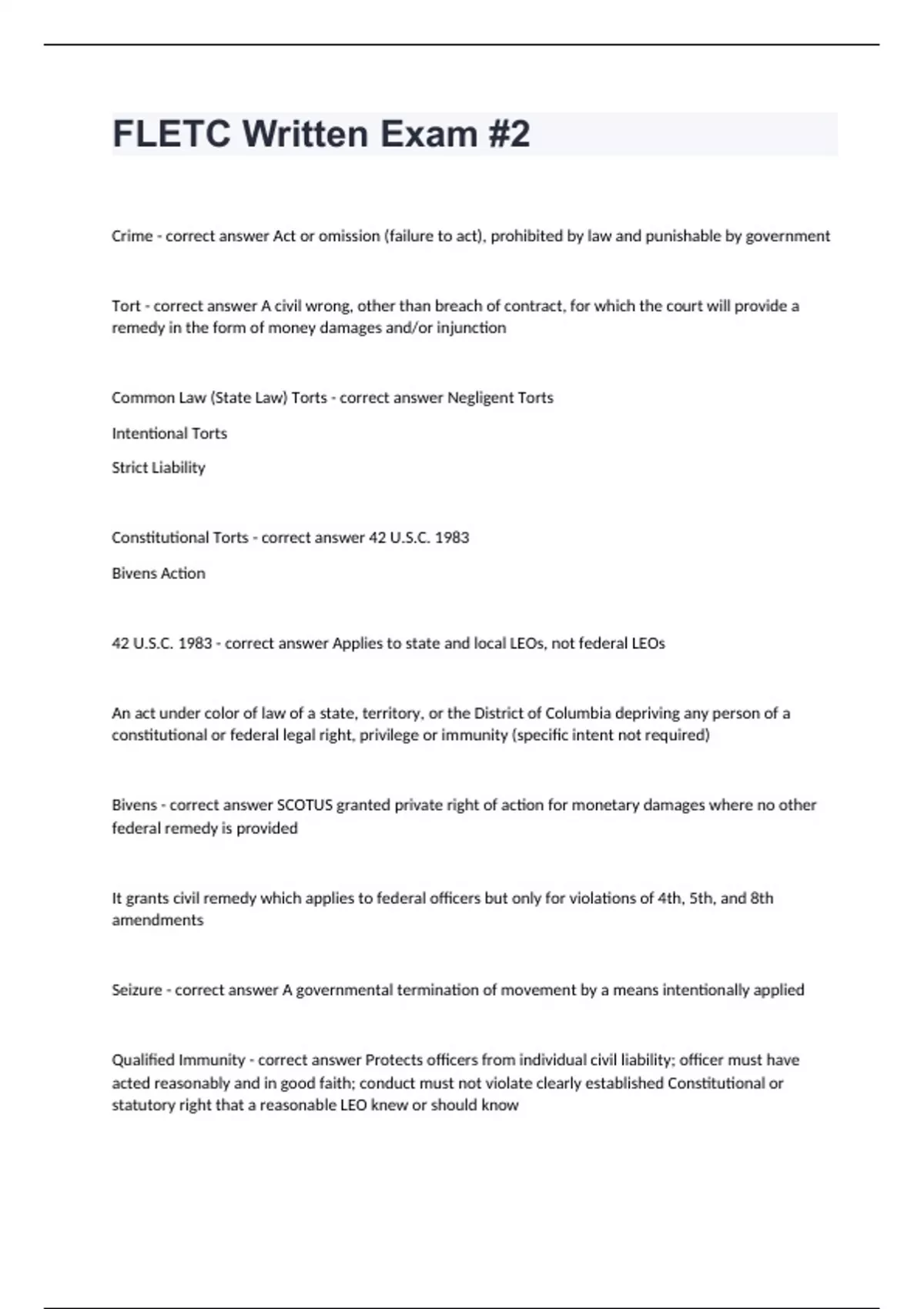 FLETC Written Exam #2 exam 2024 with 100% accurate answers