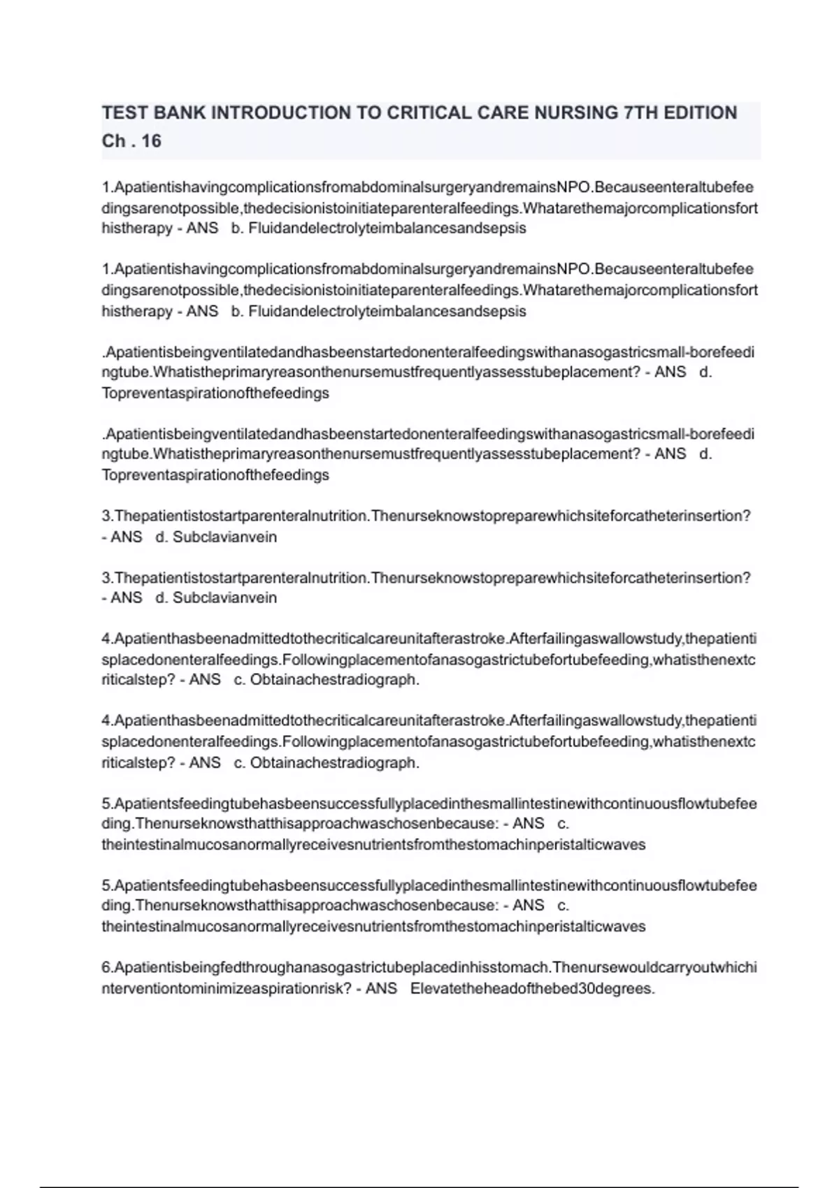 TEST BANK INTRODUCTION TO CRITICAL CARE NURSING 7TH EDITION Ch . 6