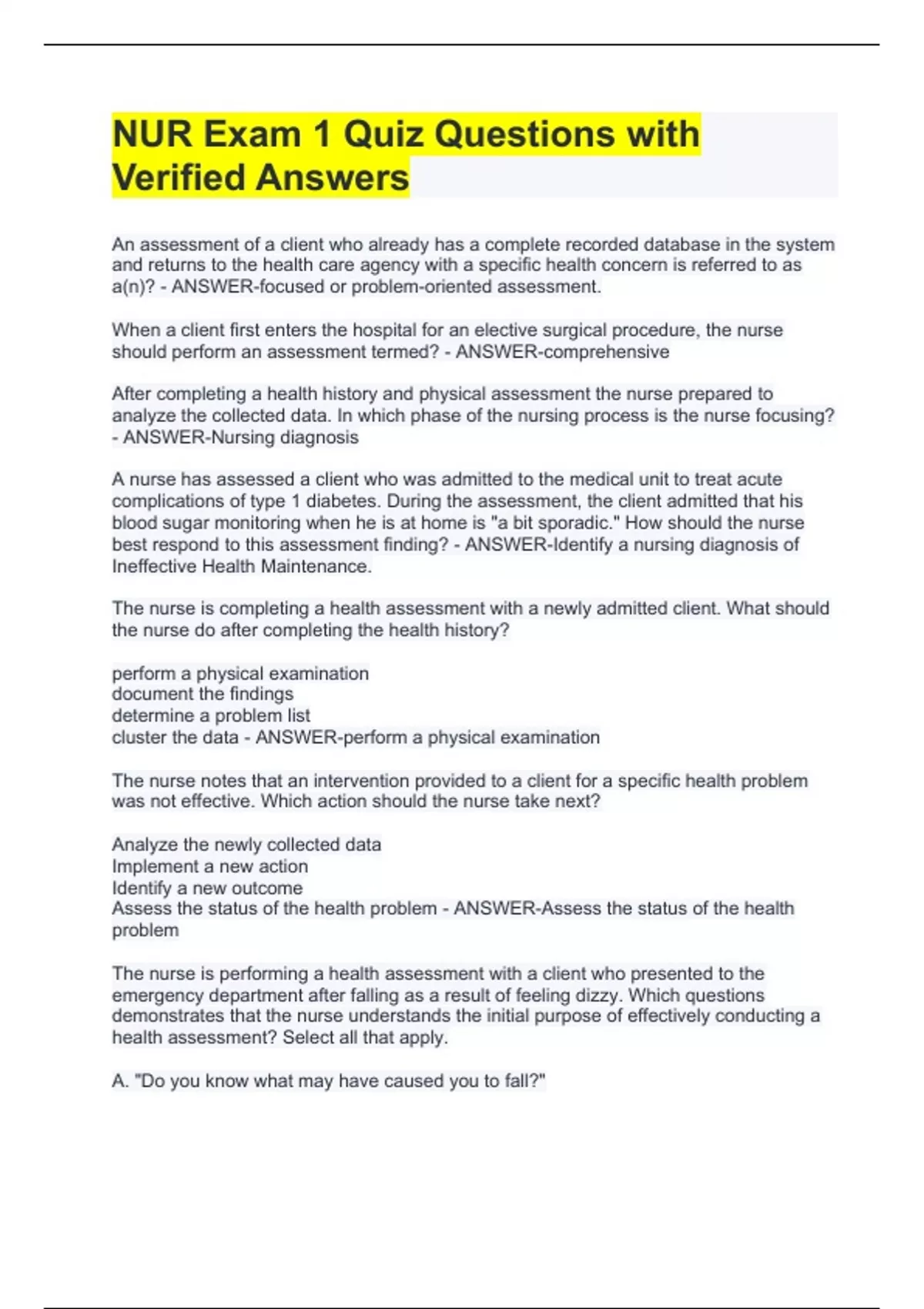 NUR Exam 1 Quiz Questions with Verified Answers