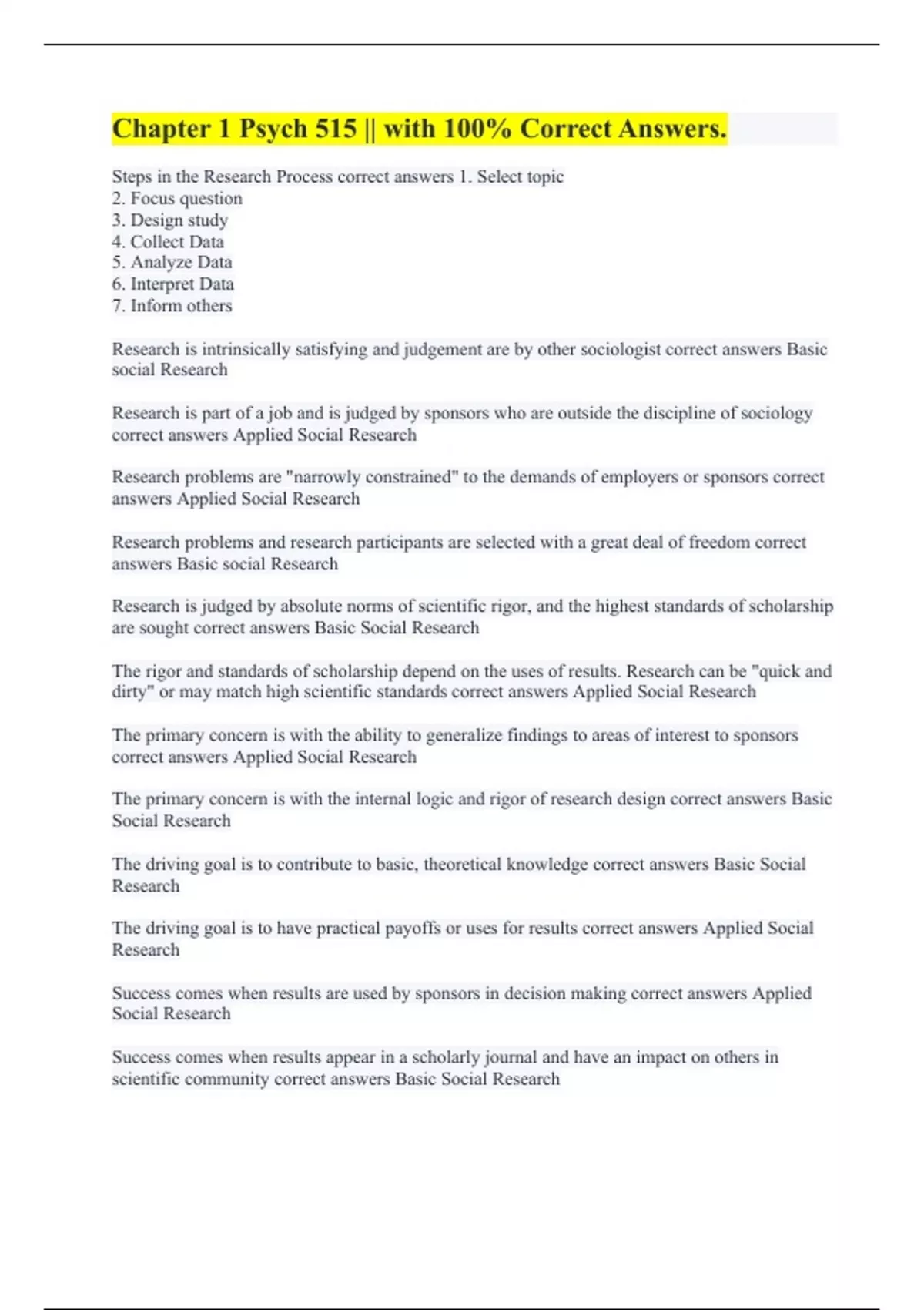 Chapter 1 Psych 515 || with 100% Correct Answers. Psych 515 Chapter 1 || All Correct. PSYC515 Exam 1 || with 100% Verified Solutions. PSYC 515 Final || with Complete Solutions. PSYC 515 FINAL ch. 11-14 || with 100% Correct Answers. PSY 515 Midterm || with 100% Errorless Answers. PSY 515 Final || All Questions Answered Correctly.