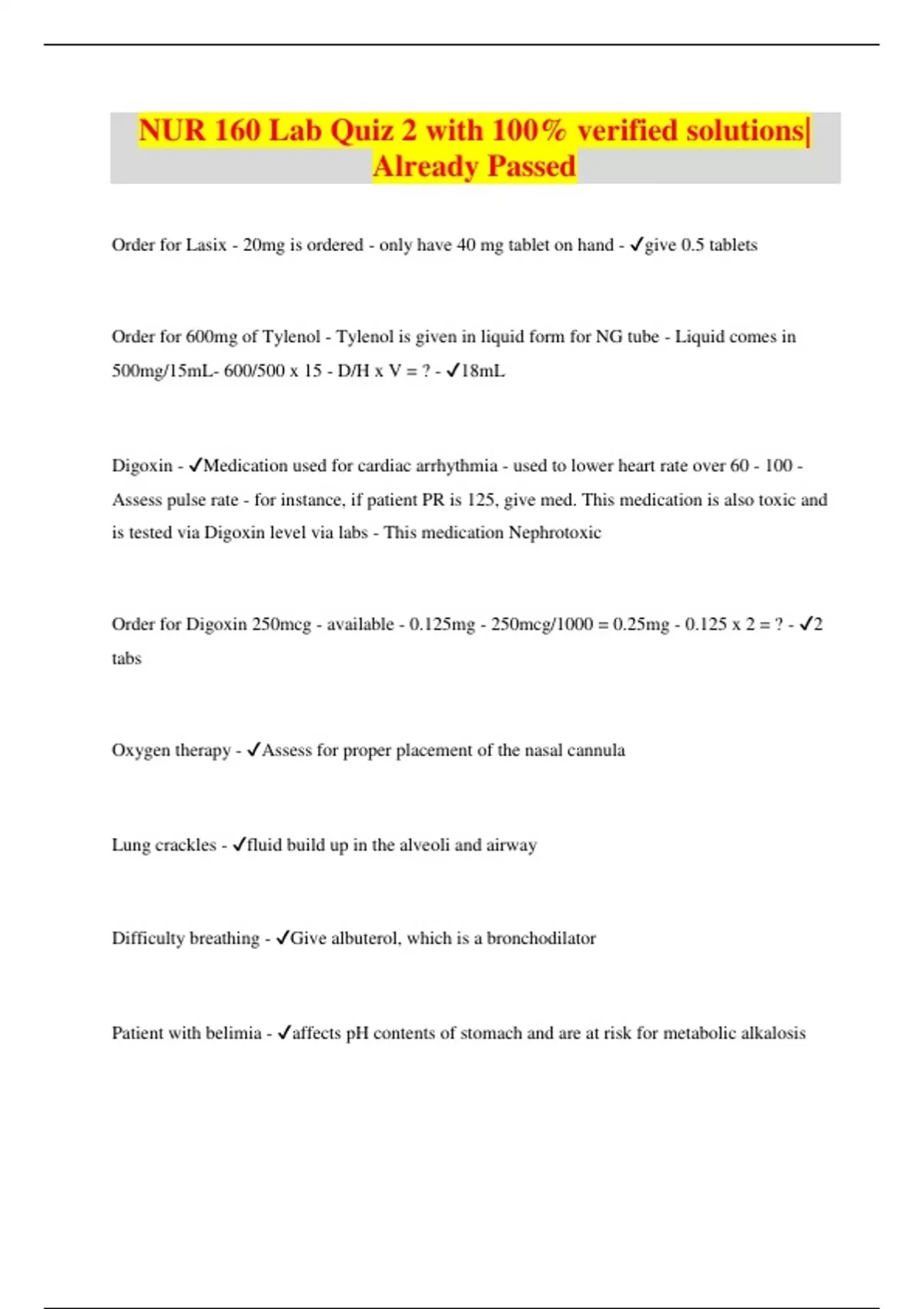 NUR 160 Lab Quiz 2 with 100% verified solutions| Already Passed