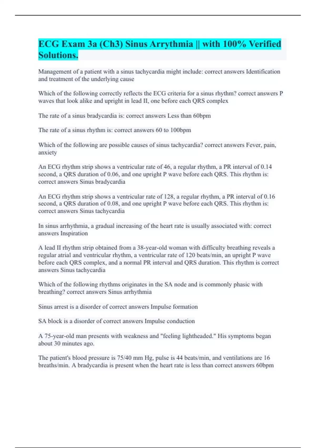 NUR 331 Cardiac ECG || with Complete Solutions. ECG Exam 3a (Ch3) Sinus Arrythmia || with 100% Verified Solutions. ECG Final Exam Study Guide || with 100% Correct Answers. ECG Test 1 || All Answers Are Correct 100%. ECG #3 || with 100% Errorless Solutions. NURS 331 Midterm 2 || All Questions Answered Correctly. Nursing 331 || with 100% Errorless An