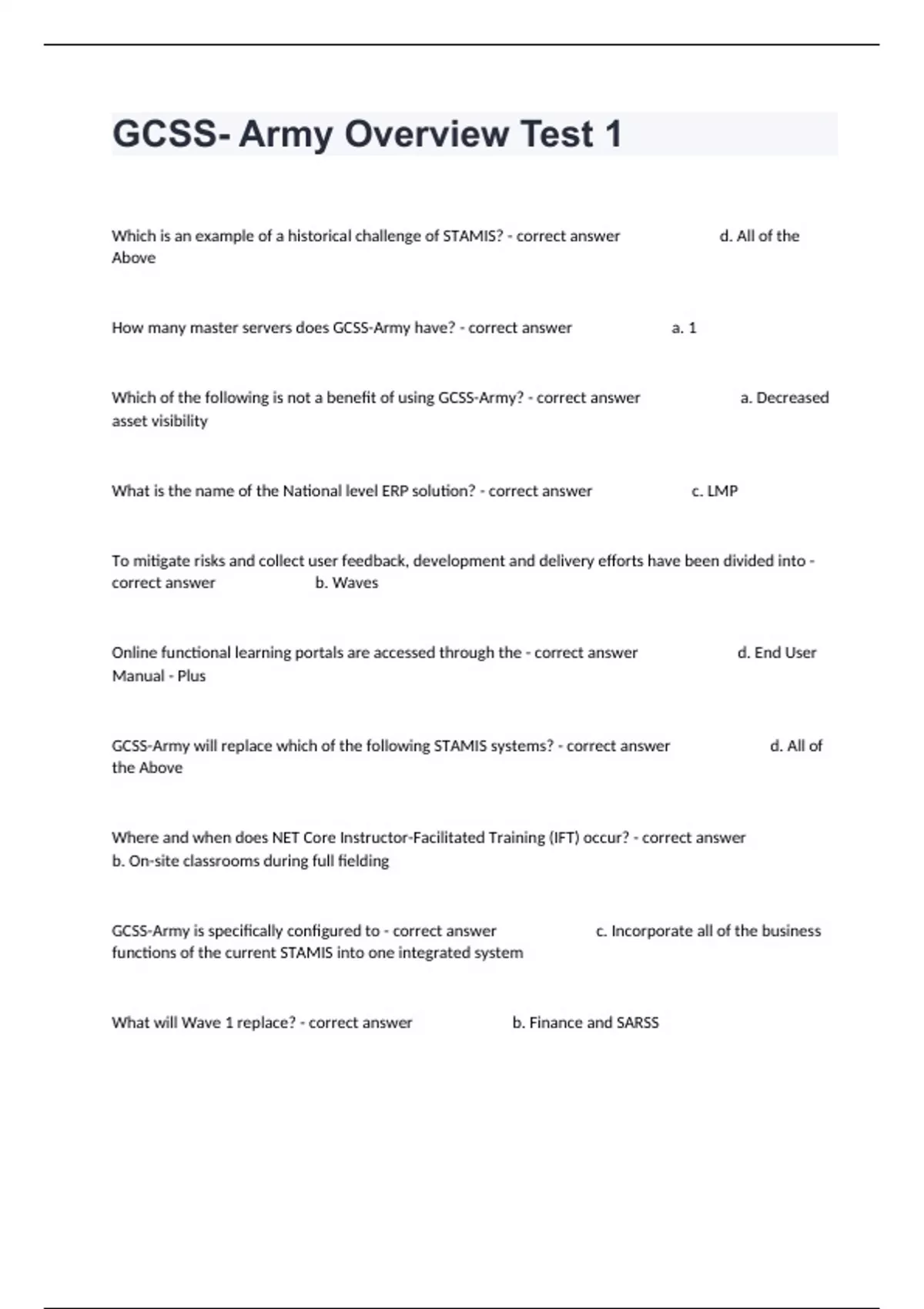 1 Exam (elaborations) GCSS-Army Store & Forward Maintenance Test 1 Practice Exam Question Fully Solved. 2 Exam (elaborations) Process a material through GCSS- Army (Test B07)(2) Exam With Complete Answers. 3 Exam (elaborations) GCSS-Army Practice Study Guide With Advanced Answers. 4 Exam (elaborations) GCSS-Army Watercraft in GCSS-Army Test 1 St