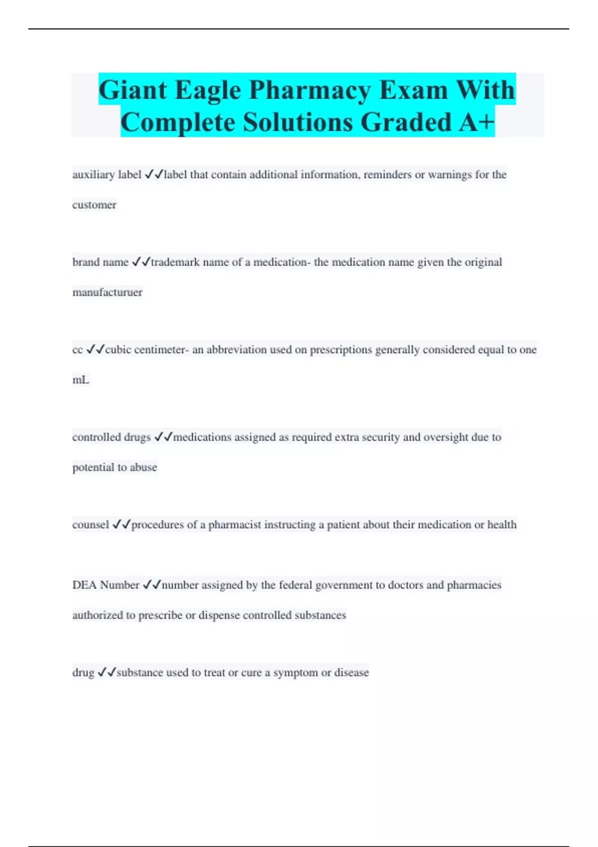 Giant Eagle Pharmacy tech test, Giant Eagle Pharmacy Tech Certification Exam Questions and Answers 100% Solved,Graded A+