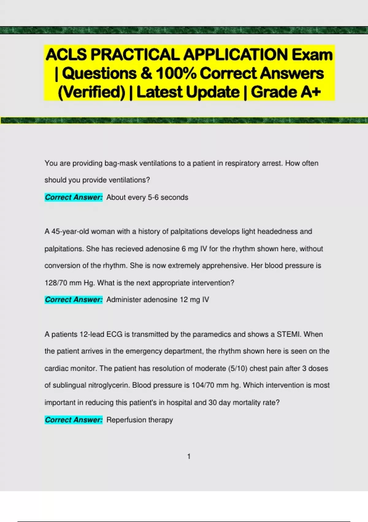 ACLS EXAM A PACK| Questions & 100% Correct Answers (Verified) | Latest Update | Grade A+
