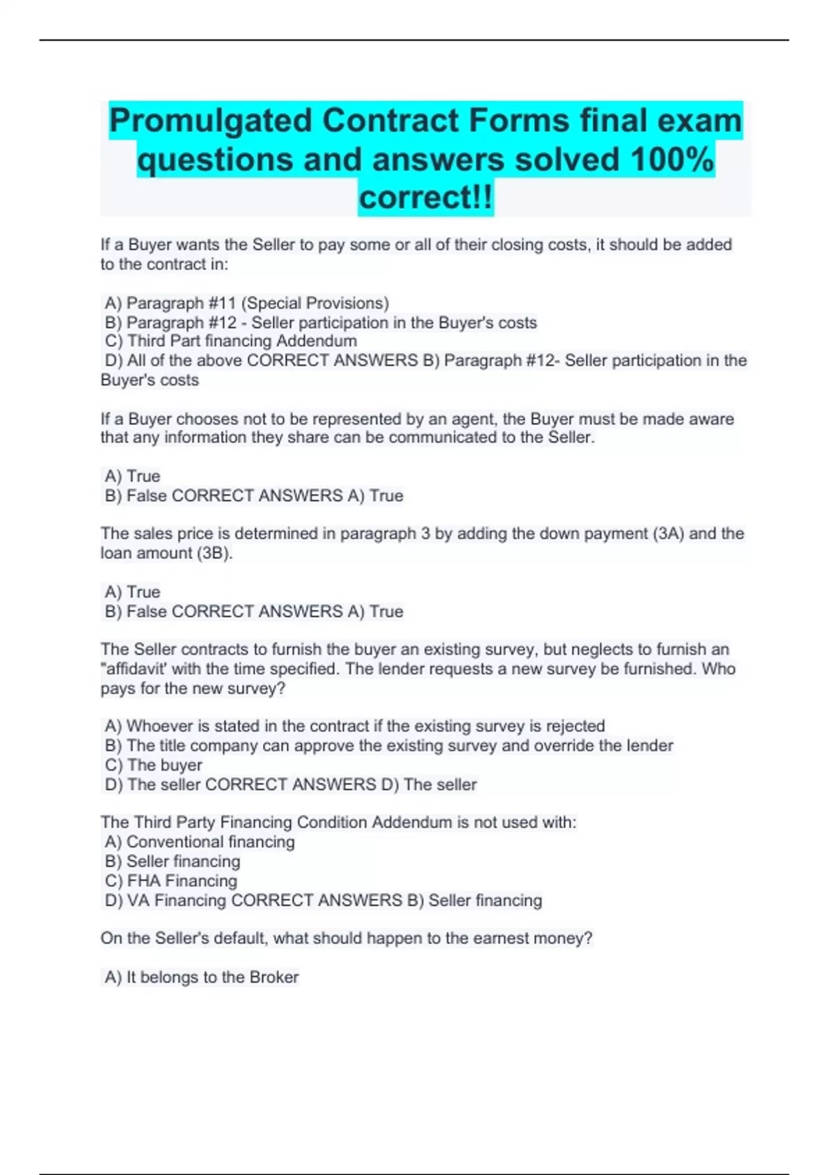 Promulgated Contract Forms final exam questions and answers solved 100% correct!! Promulgated Contract Forms: Final Exam Questions With Complete Solutions Promulgated Contract form Practice exam 2024 questions and answers rated 100% correct!!