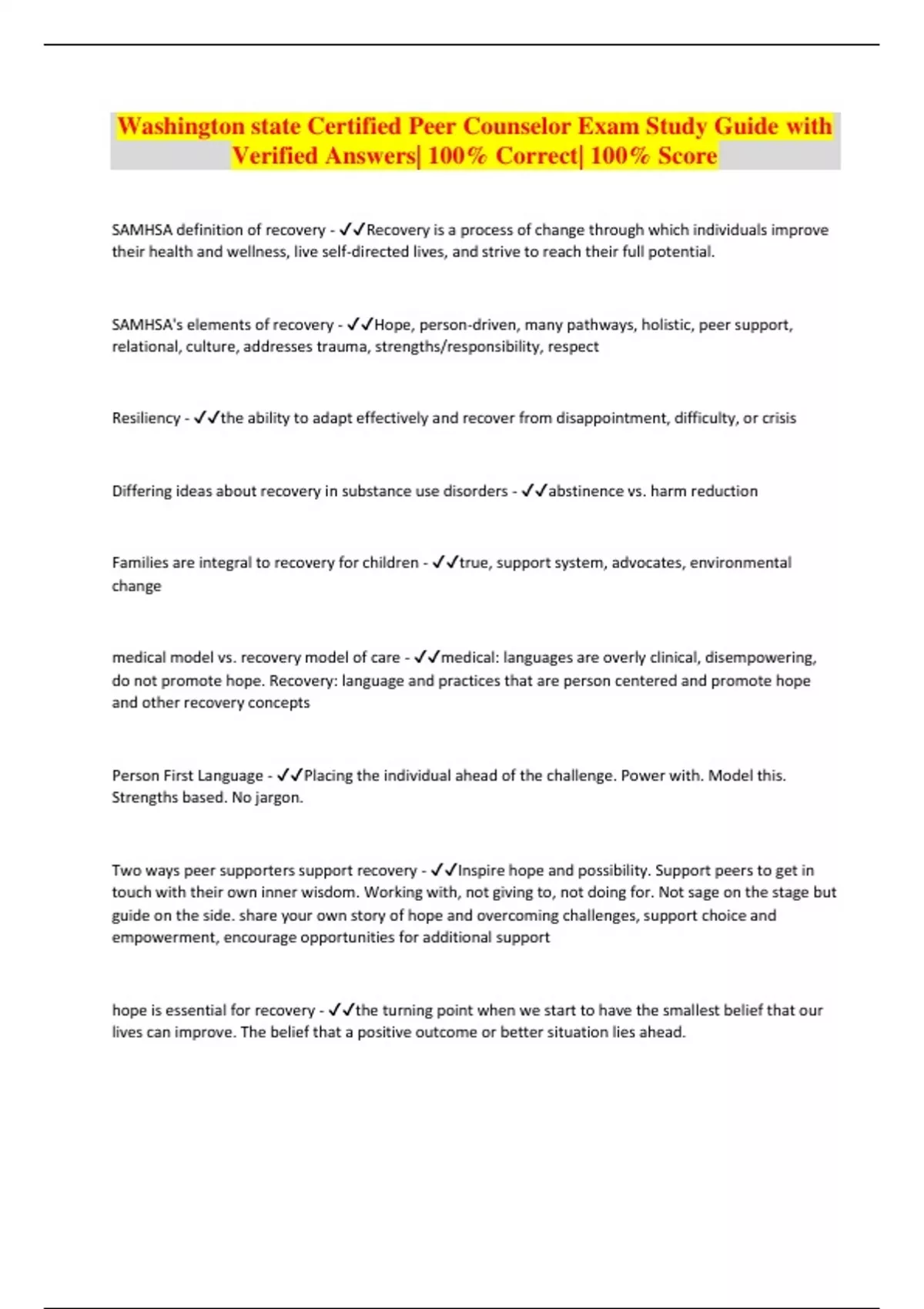 Washington state Certified Peer Counselor Exam Study Guide with Verified Answers| 100% Correct| 100% Score