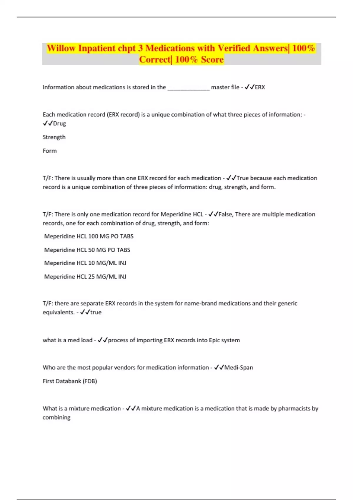 Willow Inpatient chpt 3 Medications with Verified Answers| 100% Correct| 100% Score