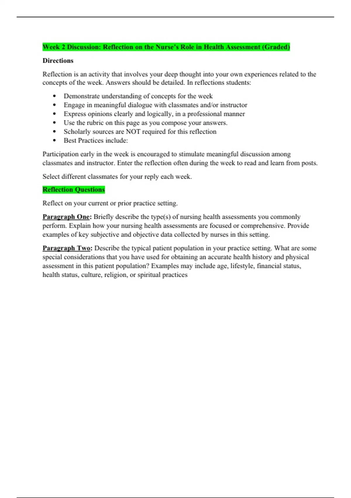 NR 305 Week 2 Discussion; Reflection on the Nurse s Role in Health Assessment (Graded_)