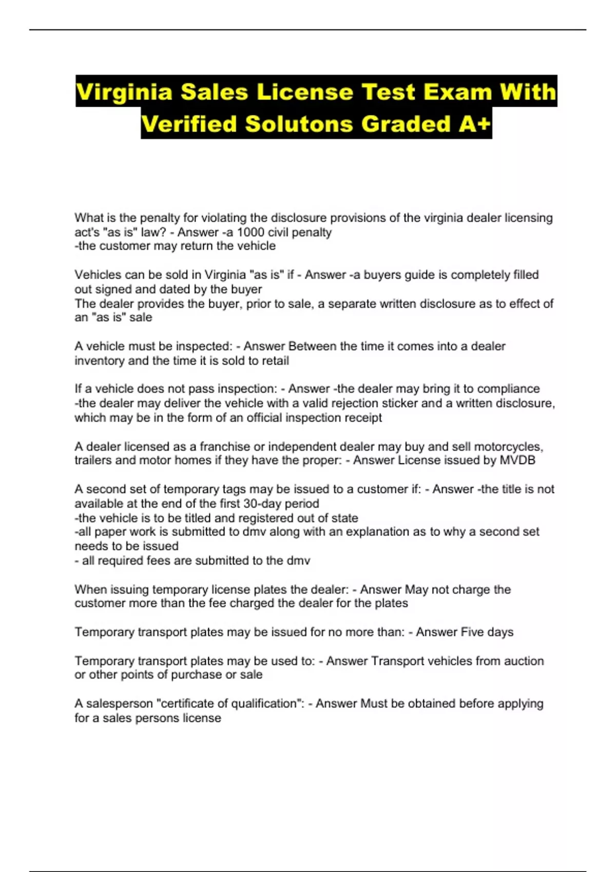 Virginia Sales License Test Exam With Verified Solutons Graded A+