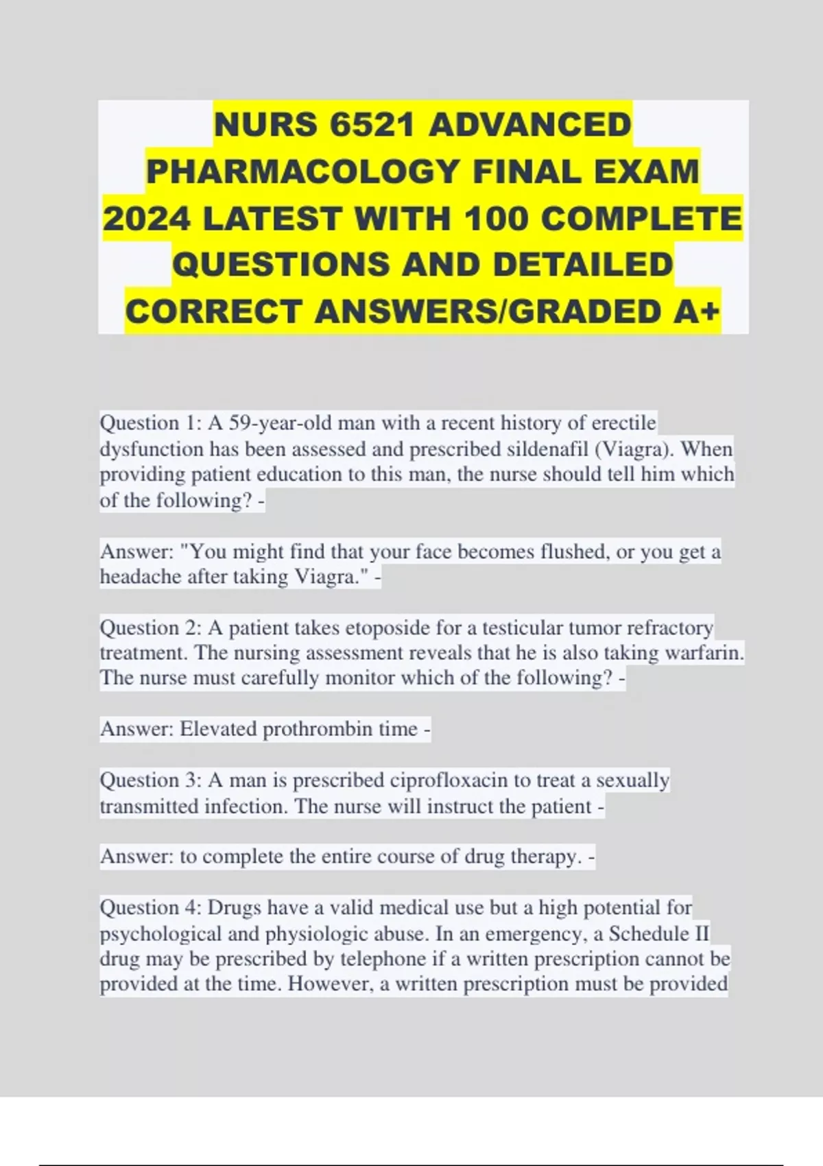 NURS 6521 ADVANCED PHARMACOLOGY FINAL EXAM 2024 LATEST WITH 100 COMPLETE QUESTIONS AND DETAILED CORRECT ANSWERS/GRADED A+
