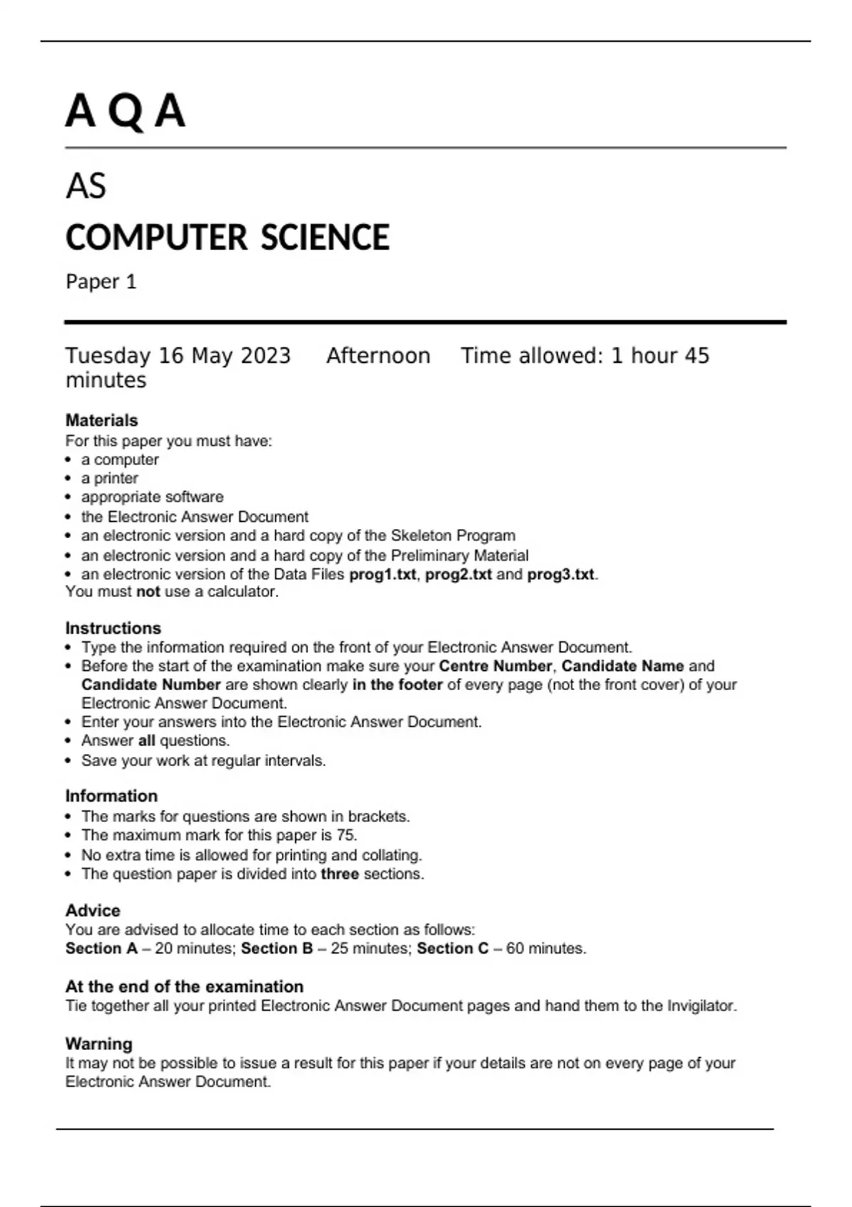 AQA AS COMPUTER SCIENCE Paper 1 QUESTION PAPER AND MARK SCHEME JUNE 2023