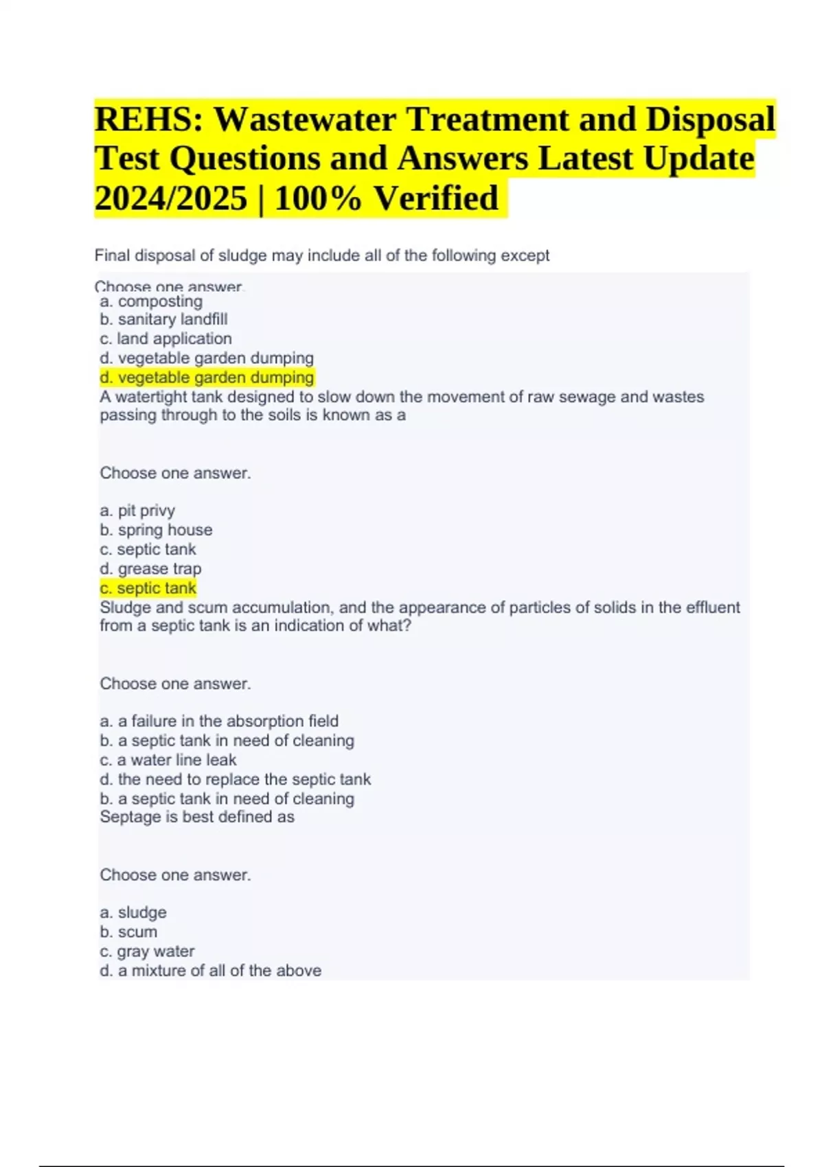 REHS/RS Exam Questions| With 100% Correct Answers | Updated & Verified | REHS/RS Exam Questions With Correct Answers | REHS Exam Questions and Answers & REHS: Wastewater Treatment and Disposal Test Questions and Answers Latest Update 2024/2025 | 100% Veri