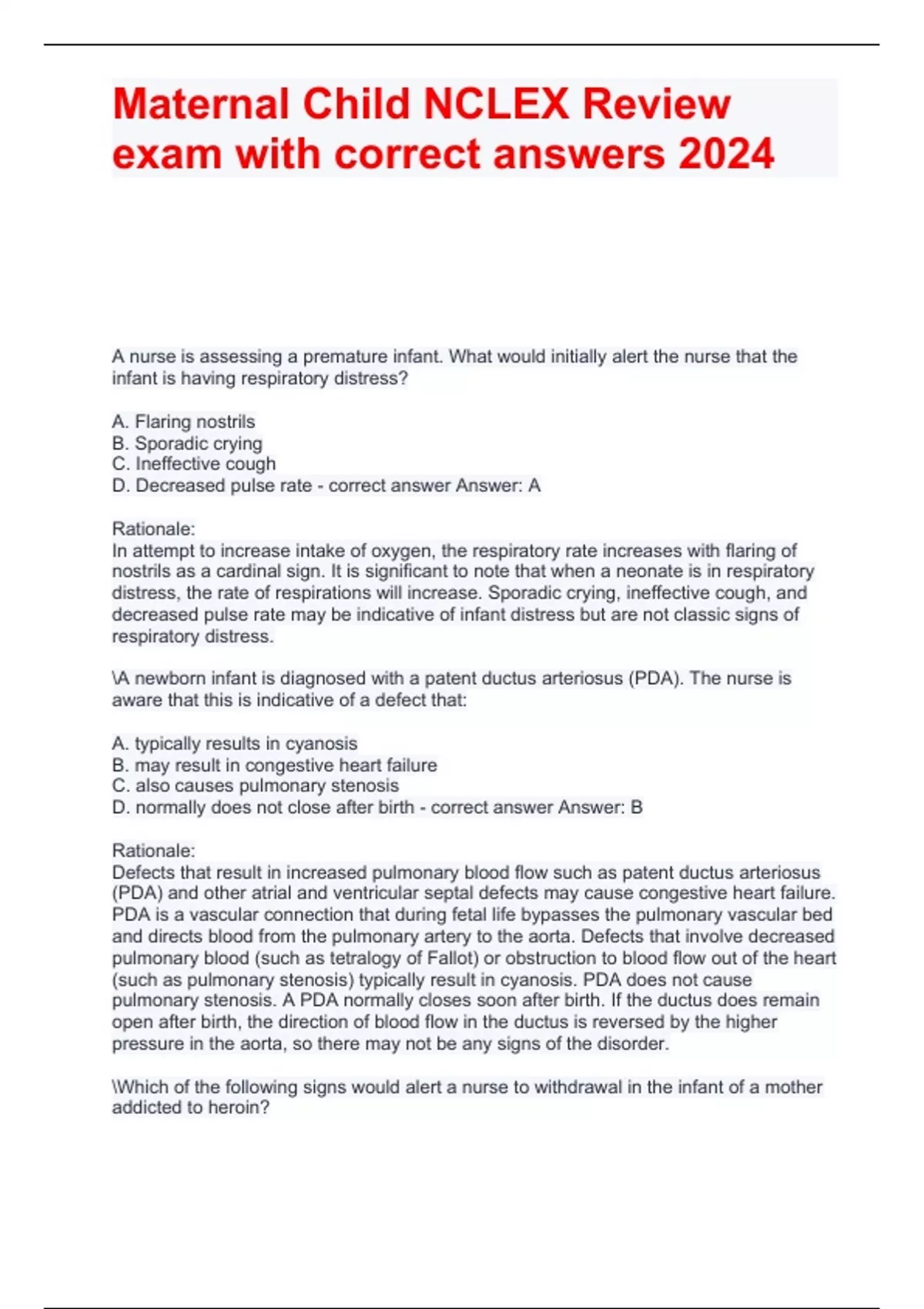 A nurse is assessing a premature infant. What would initially alert the nurse that the infant is having respiratory distress? A. Flaring nostrils B. Sporadic crying C. Ineffective cough D. Decreased pulse rate - correct answer Answer: A Rationale: In attempt to increase intake of oxygen, the respiratory rate increases with flaring of nostrils as