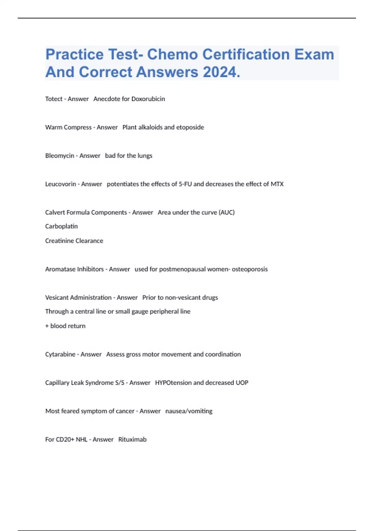 1 Exam (elaborations) 3S Oncology Chemo Certification Comprehensive Exam With Solved Solutions 2024. 2 Exam (elaborations) Chemotherapy and immunotherapy License Exam Solved 100% Correct 2024. 3 Exam (elaborations) Chemotherapy Certification Latest Exam And Verified Answers 2024 . 4 Exam (elaborations) Chemotherapy/Immunotherapy Certificate Cour