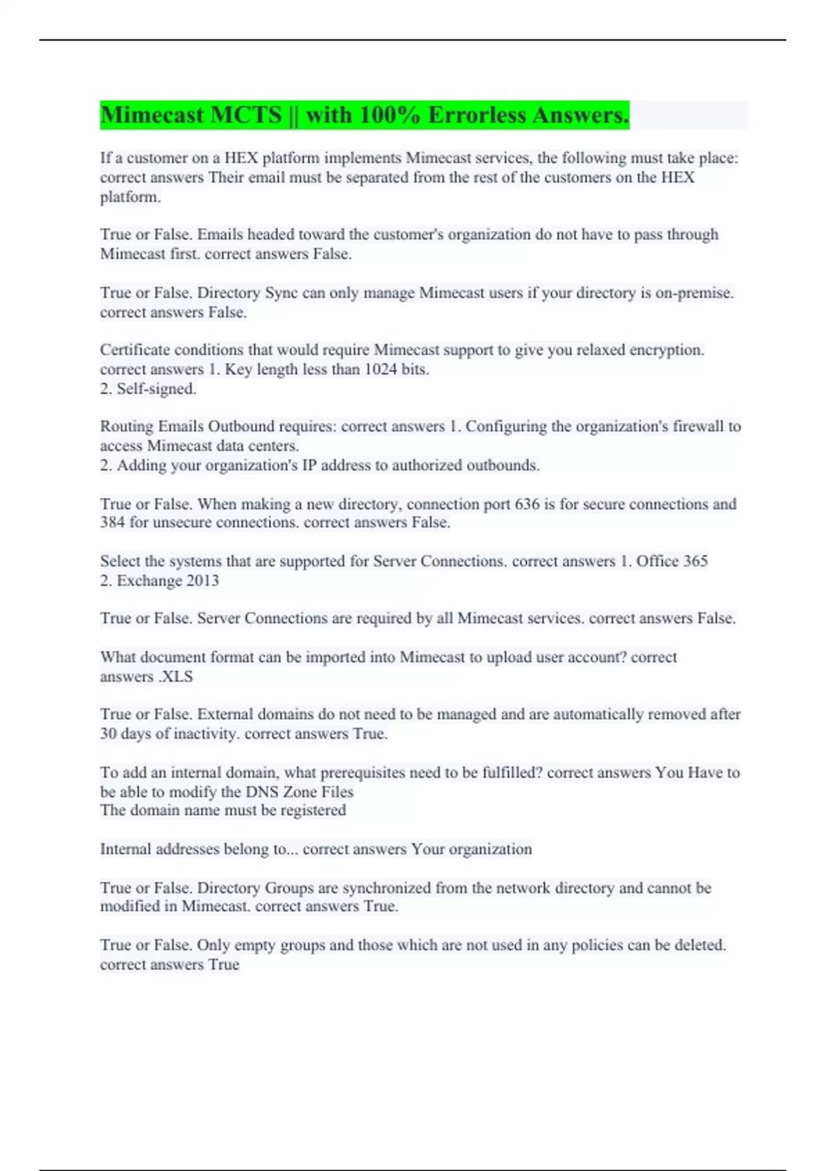 Network Security – Final || All Questions Answered Correctly. Mimecast MCTS || with 100% Errorless Answers. Mimecast MGTP || All Answers Are Correct 100%. Mimecast secure-email-gateway-level-1-warrior || with Complete Solutions. MIMECAST SecureEmailGateway01-Setup and Analystic || with 100% Verified Solutions. Mimecast Warrior Level 1 || A+ Graded