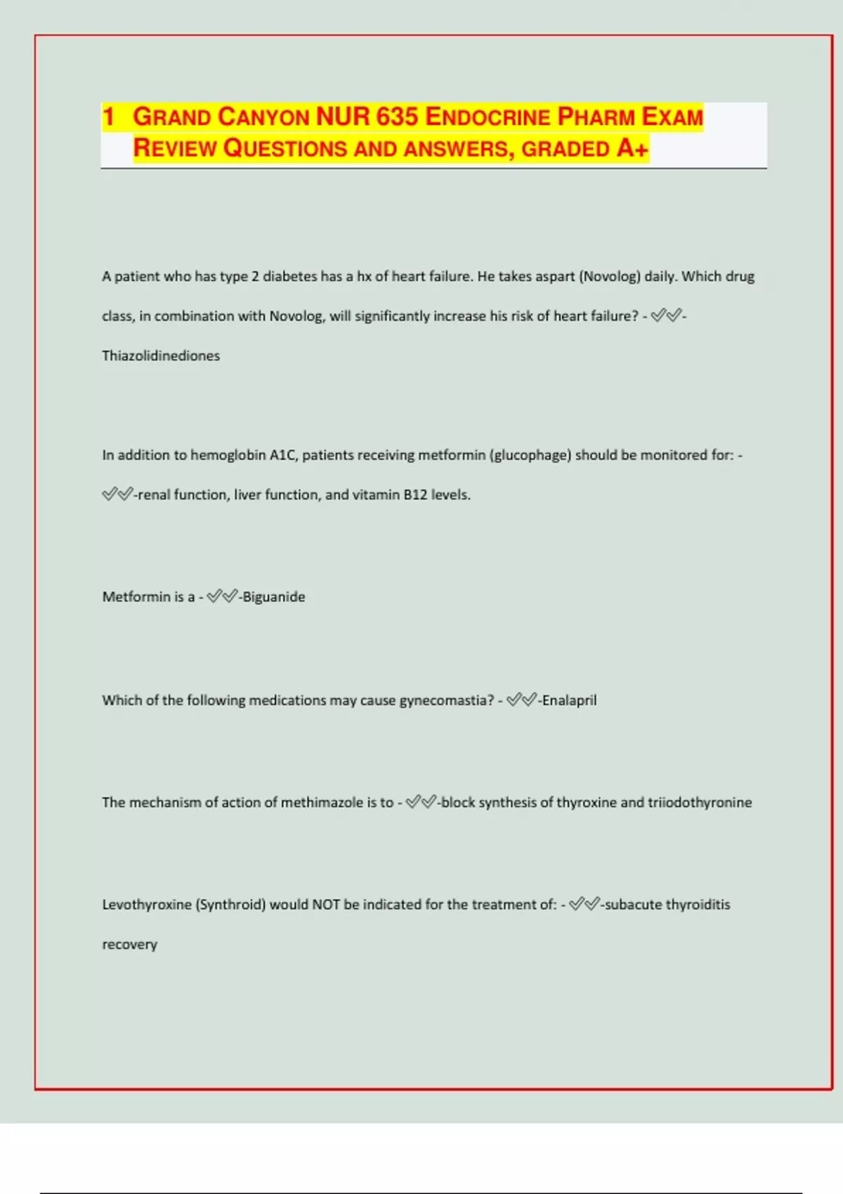 GRAND CANYON NUR 635 ENDOCRINE PHARM EXAM REVIEW QUESTIOUser | 2024/2025 Exam PREDICTIONS|NS AND ANSWERS, GRADED A+