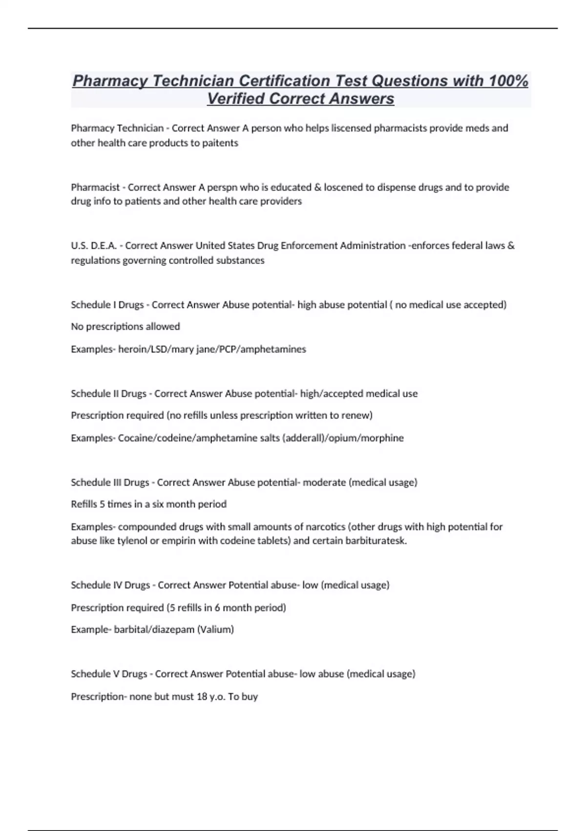 Pharmacy Technician Certification Test Questions with 100% Verified Correct Answers, Pharmacy Technician Certification Exam 100 Questions with Complete Solutions 100% Verified Correct Answers Rated A+ 2024/2025, Pharmacy Technician Practice Test with Complete Solutions 100% Verified Answers, Pharmacy Technician Certification Questions with Complete