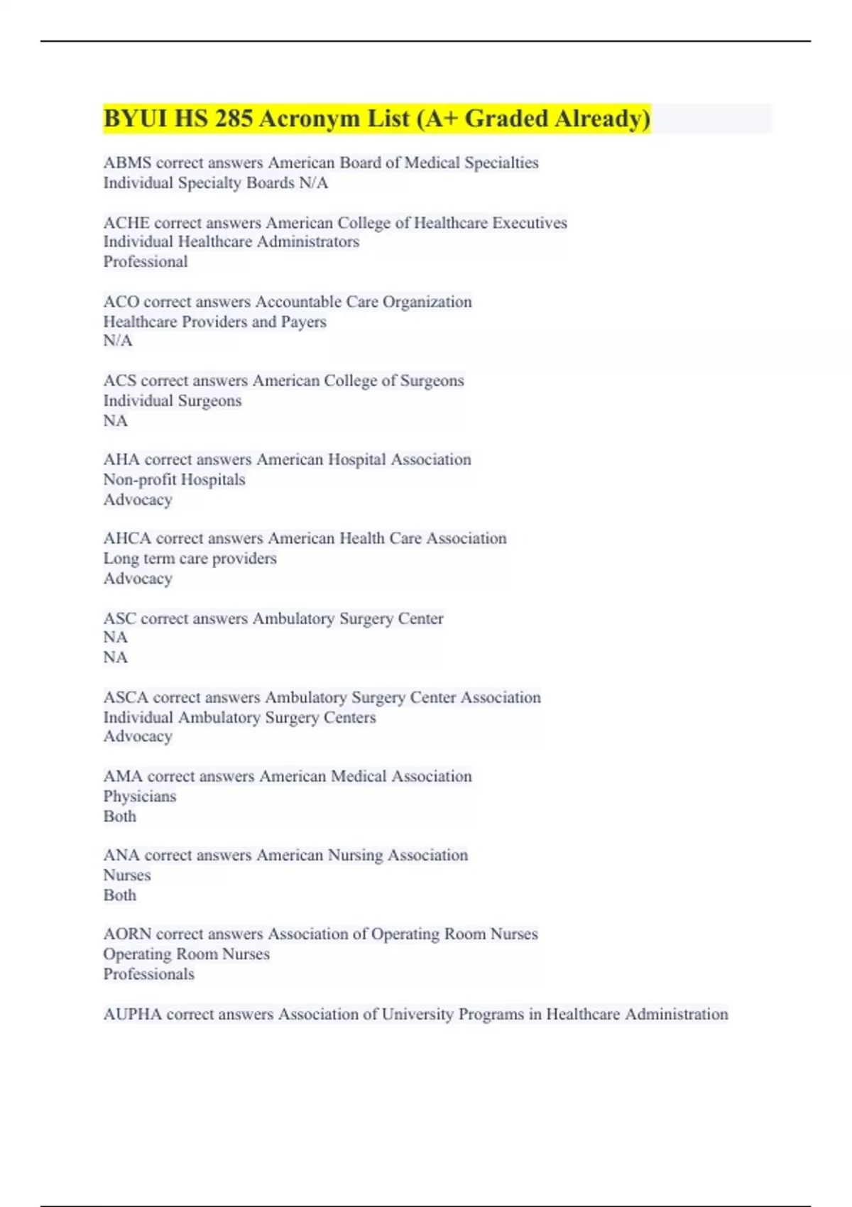 BYUI HS 285 Acronym List (A+ Graded Already) HS 285 (A+ Guaranteed) 2024. HS 285 W14 Final Exam (100% Correct Answers) HS 285 test 1 (with Answers) HS 285 Governance in Healthcare Industry (with Complete Solutions) . HS 285 Final Review (A+ Graded) 2024. HS 285 Acronyms (100% Correct Answers)
