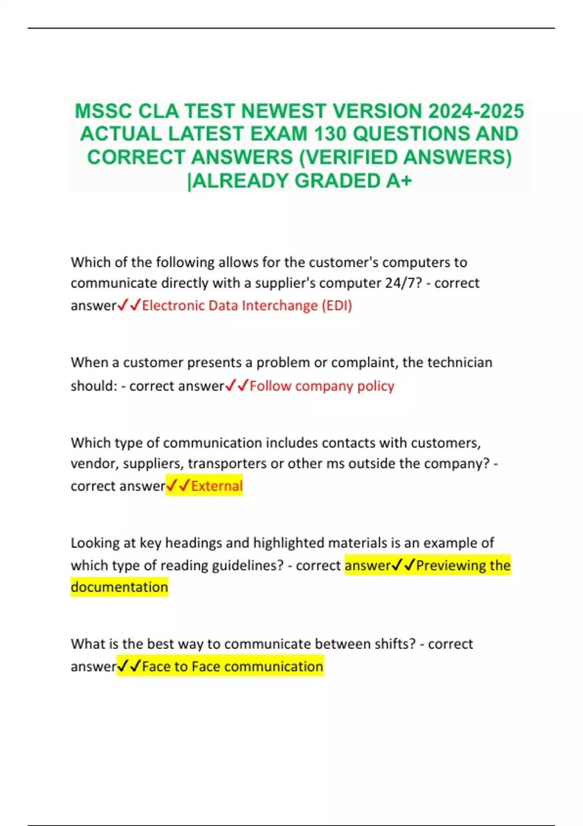 MSSC CLA TEST NEWEST VERSION ACTUAL EXAM 110+ QUESTIONS AND CORRECT ANSWERS (VERIFIED ANSWERS) |ALREADY GRADED A+ 2 Exam (elaborations) MSSC CLA TEST NEWEST VERSION ACTUAL LATEST EXAM 130 QUESTIONS AND CORRECT ANSWERS (VERIFIED ANSWERS) |ALREADY GRADED A+