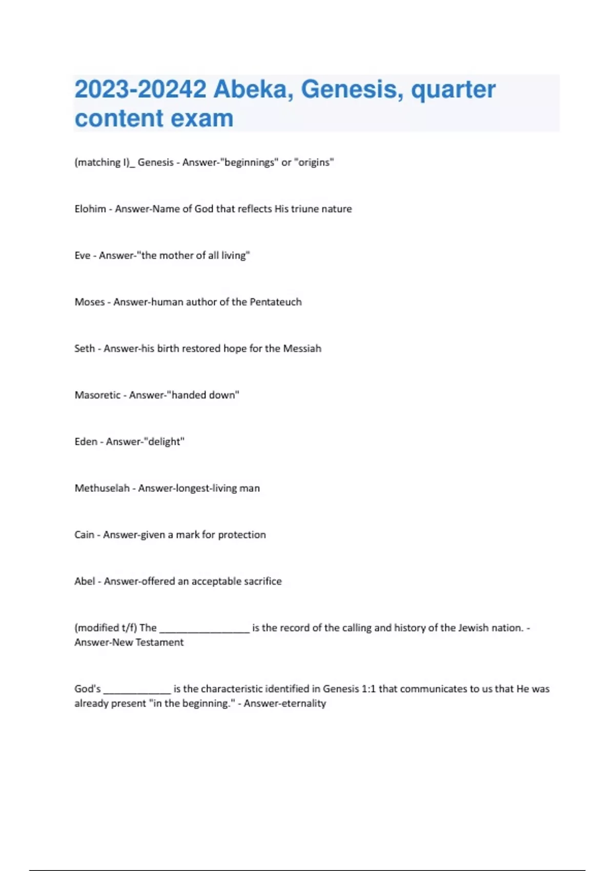 Abeka, Genesis, quarter content exam (Questions & Answers) Passed!!
