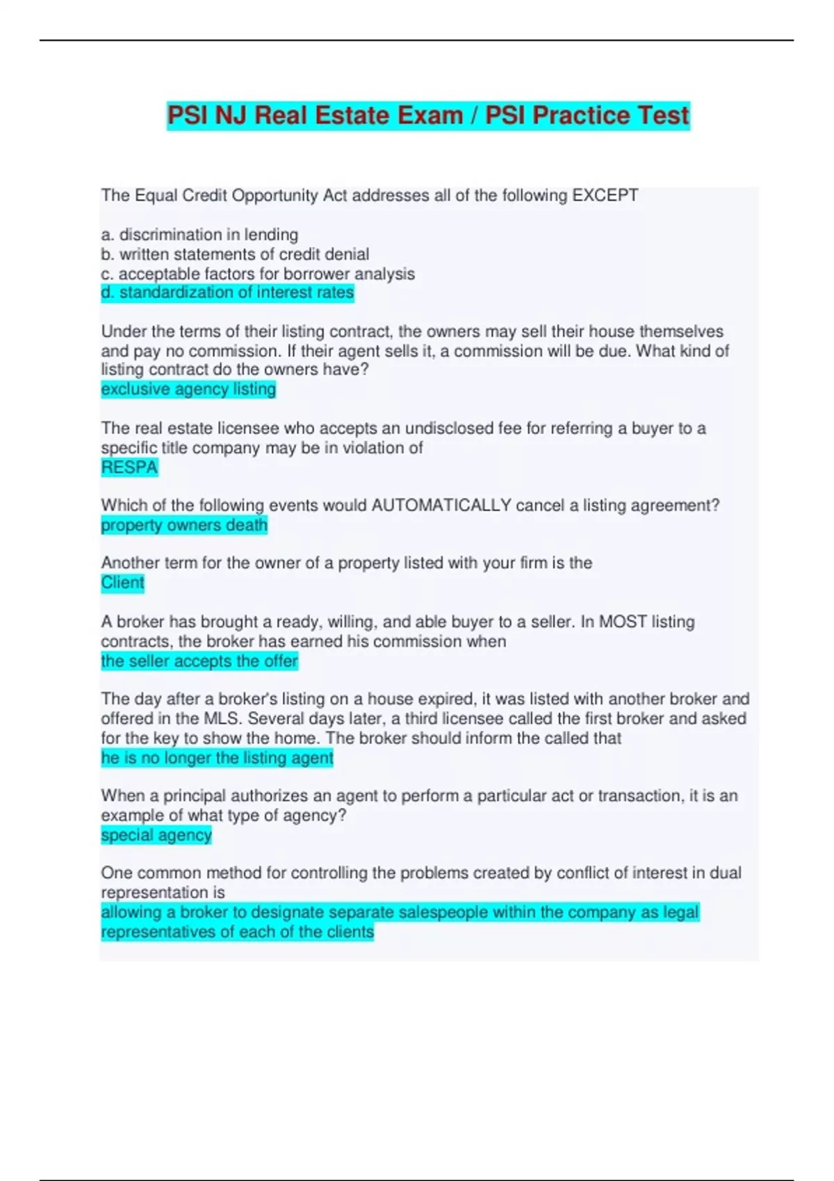 PSI NJ Real Estate Exam / PSI Practice Test - Q & A