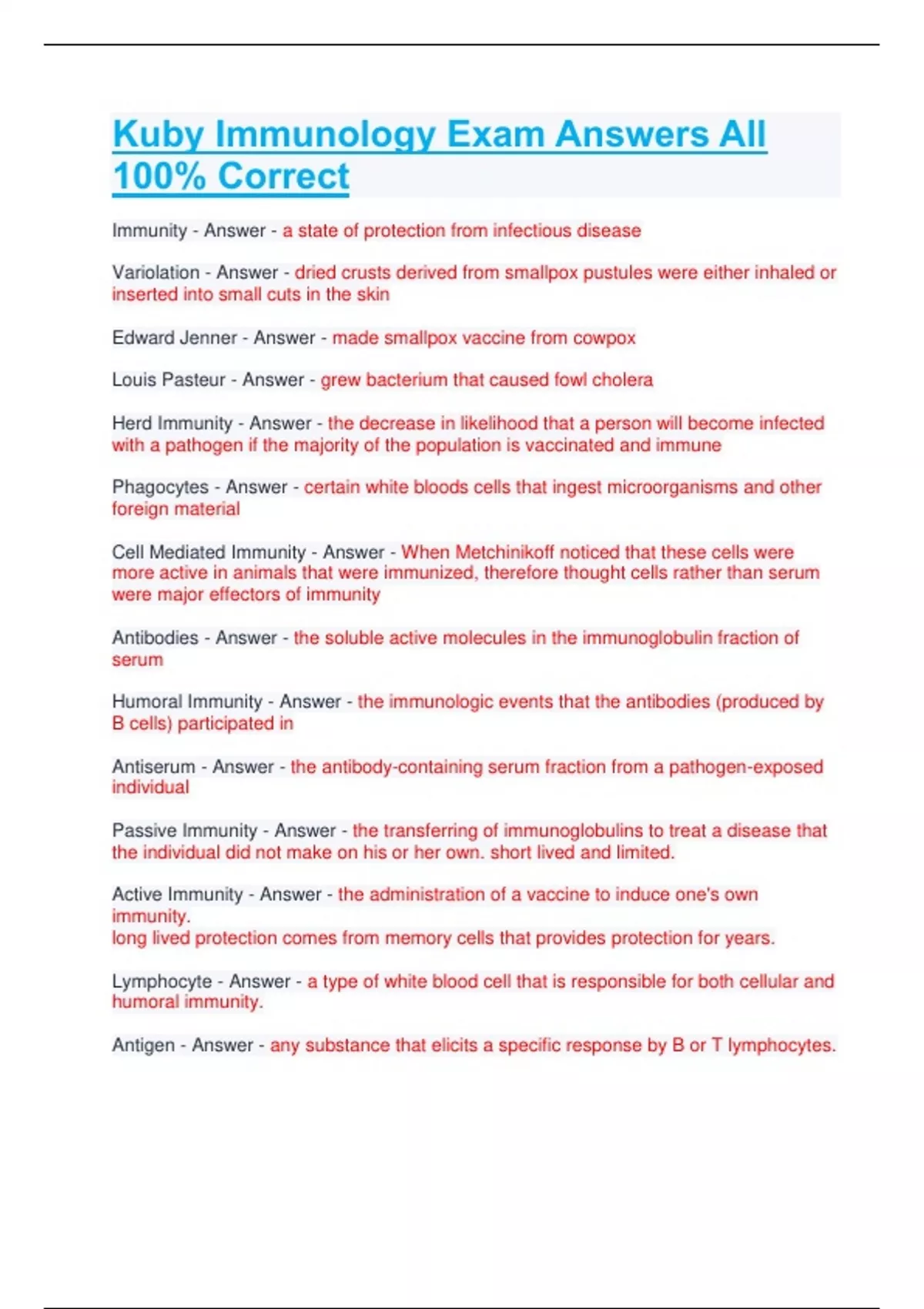 Bundle For Kuby Immunology Exam Correct Solutions All Correct