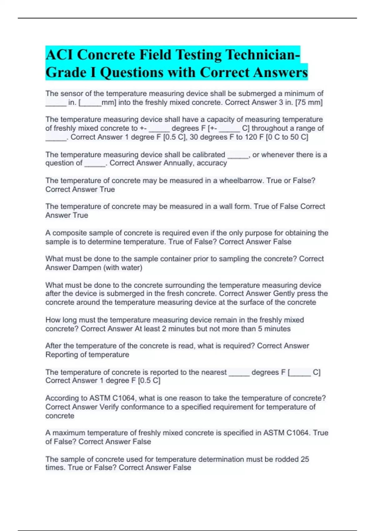 ACI Concrete Field Testing Technician- Grade I Questions with Correct Answers ACI Test Questions with Complete Answers (A+ Graded) ACI Concrete Field Testing Technician Grade 1 Study Guide Questions with Correct Answers ACI Concrete Field Testing Technician - Grade I Questions with Correct Answers ACI Certification - Concrete Field Testing Technici