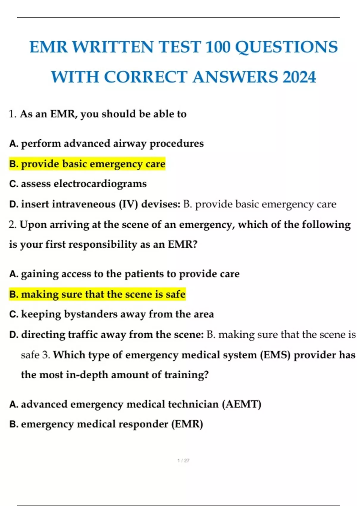 EMR WRITTEN EXAM QUESTIONS WITH CORRECT ANSWERS 2024