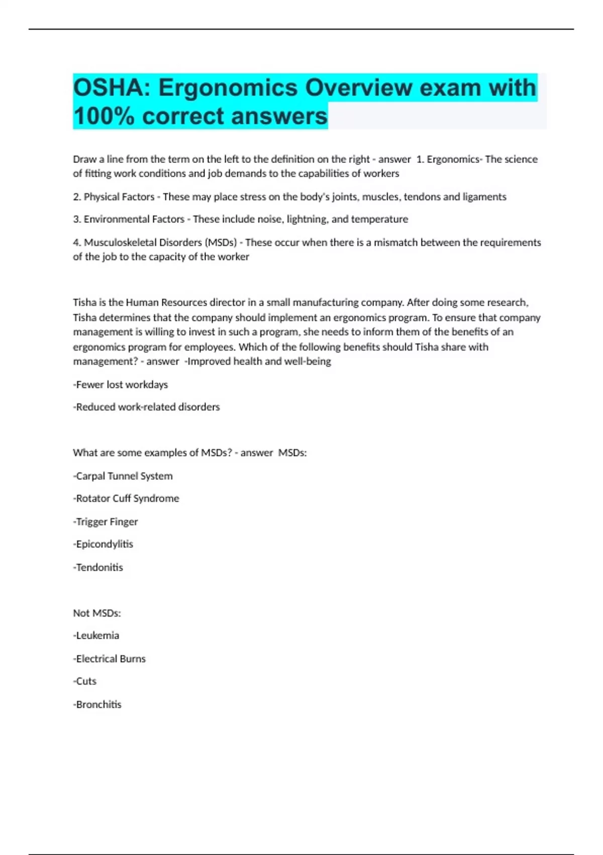OSHA: Ergonomics Overview exam with 100% correct answers