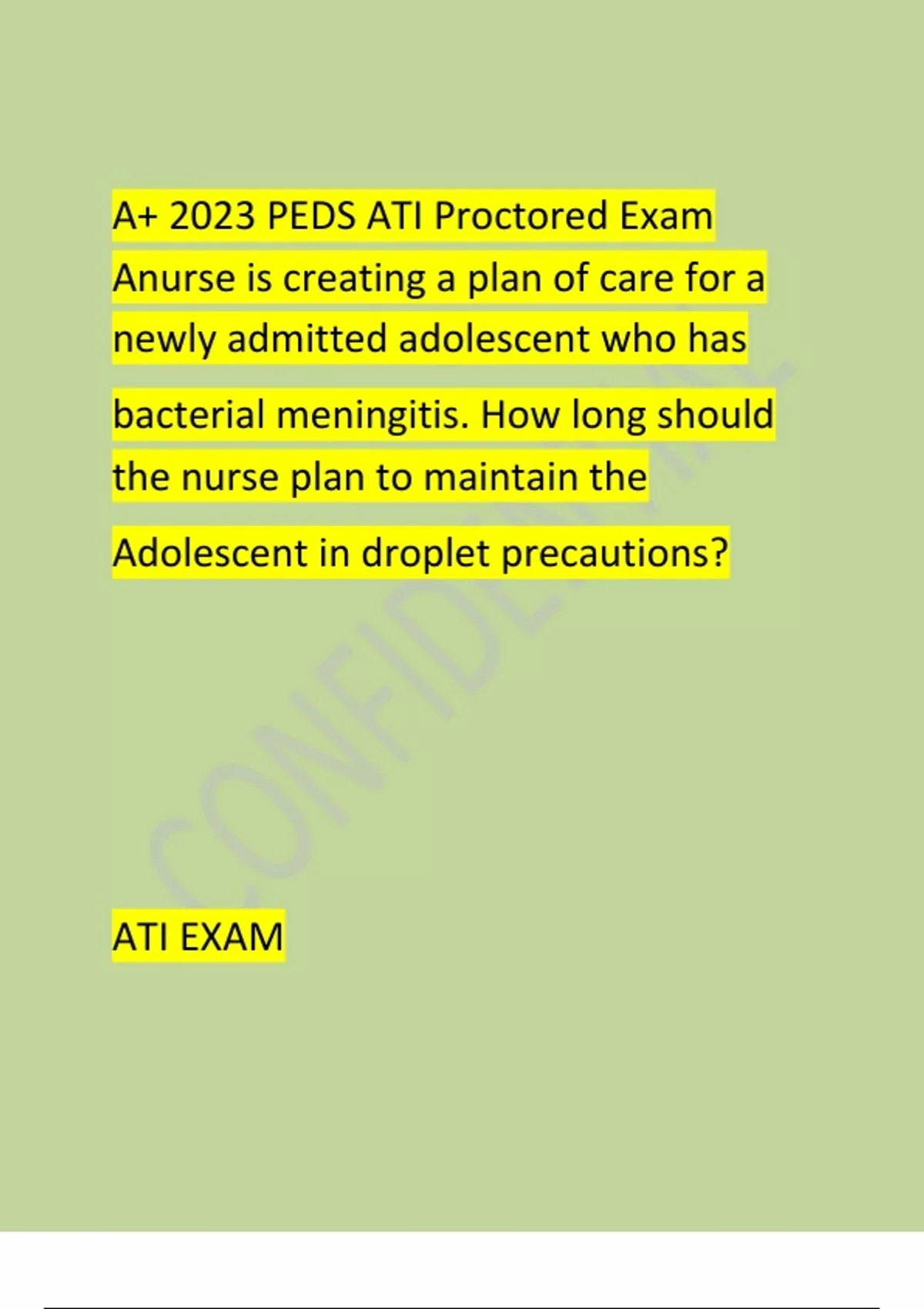 A+ 2023 PEDS ATI Proctored Exam Anurse is creating a plan of care for a newly admitted adolescent who has bacterial meningitis. How long should the nurse plan to maintain the Adolescent in droplet precautions?