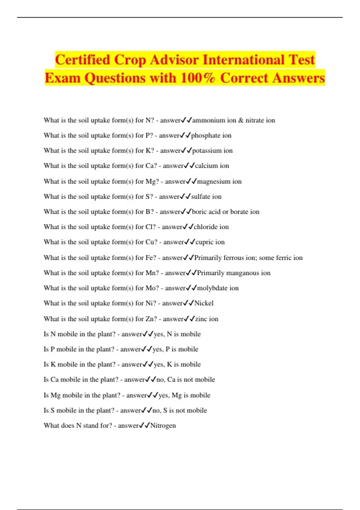 Certified Crop Advisor International Test Exam Questions with 100% Correct Answers