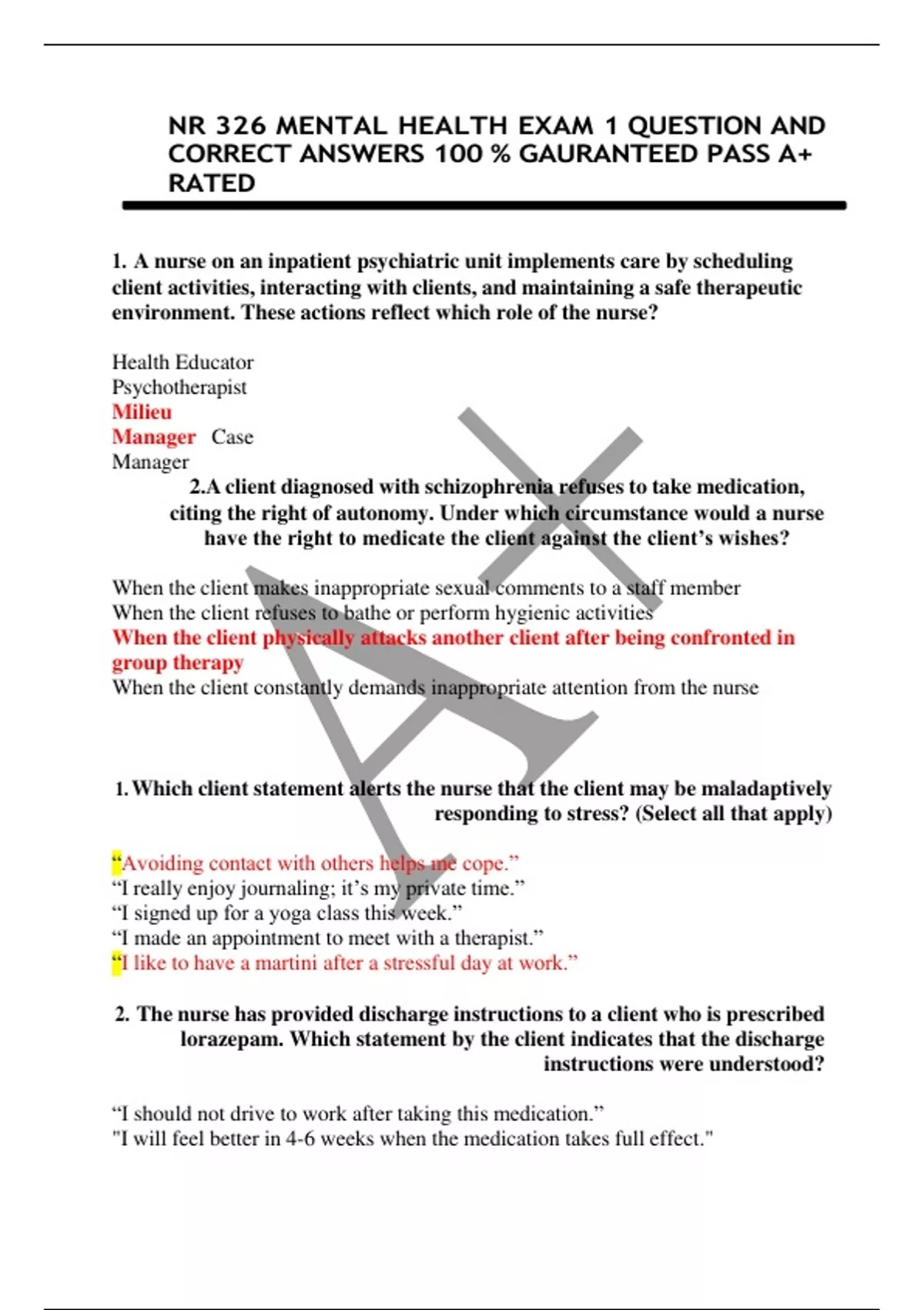 MENTAL HEALTH EXAMS QUESTION AND CORRECT ANSWERS LATEST 2024 NURS 2488 MENTAL HEALTH EXAM 1 QUESTION AND CORRECT ANSWERS LATEST 2024 COMPLETE SOLUTION MENTAL HEALTH EXAM STUDY GUIDE (CHAPTER 1, 2, 5, 17, 18, 19 &39 COVERED) COMPLETE SOLUTION NURS 2488 SECTION 06 MENTAL HEALTH NURSING WINTER EXAM 3 QUESTION AND ANSWERS COMPLETE A+ SCORE