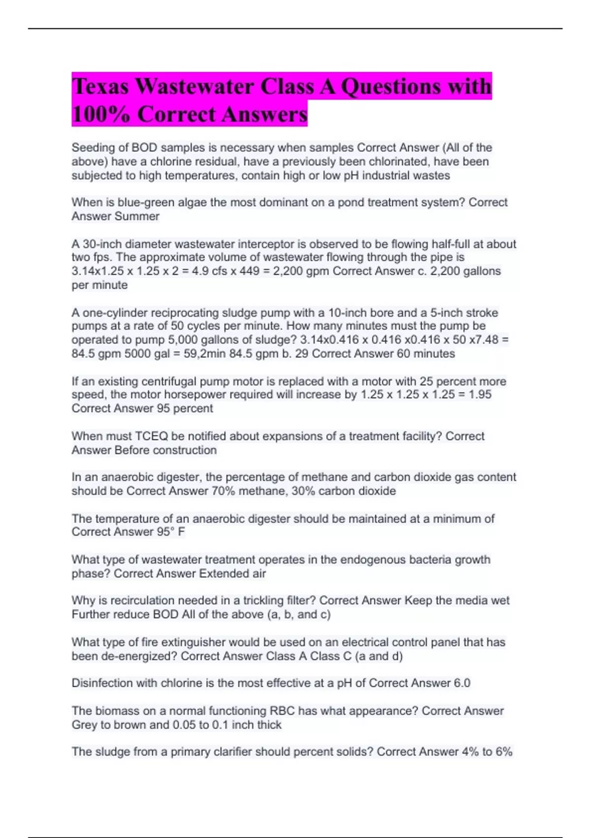 Wastewater Class B Texas Questions with 100% Correct Answers Texas Wastewater B Exam Questions with 100% Correct Answers Texas Wastewater Class A (Test 3) Questions with 100% Correct Answers Texas Wastewater A Questions with 100% Correct Answers TX Class C Wastewater Treatment License Questions with Correct Answers