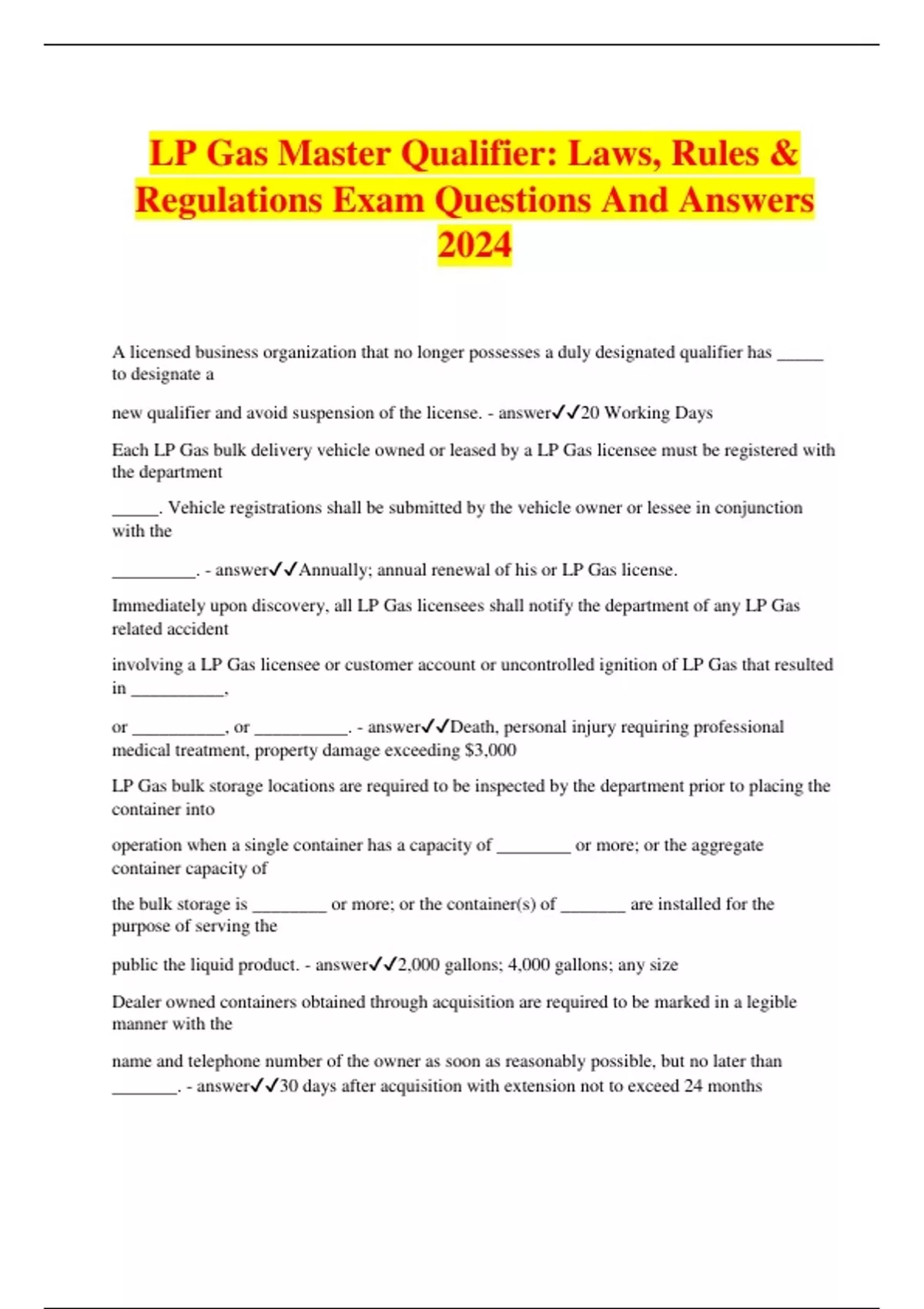 LP Gas Master Qualifier: Transportation of LP Gas Exam Questions with 100% Correct Answers 2024/2025