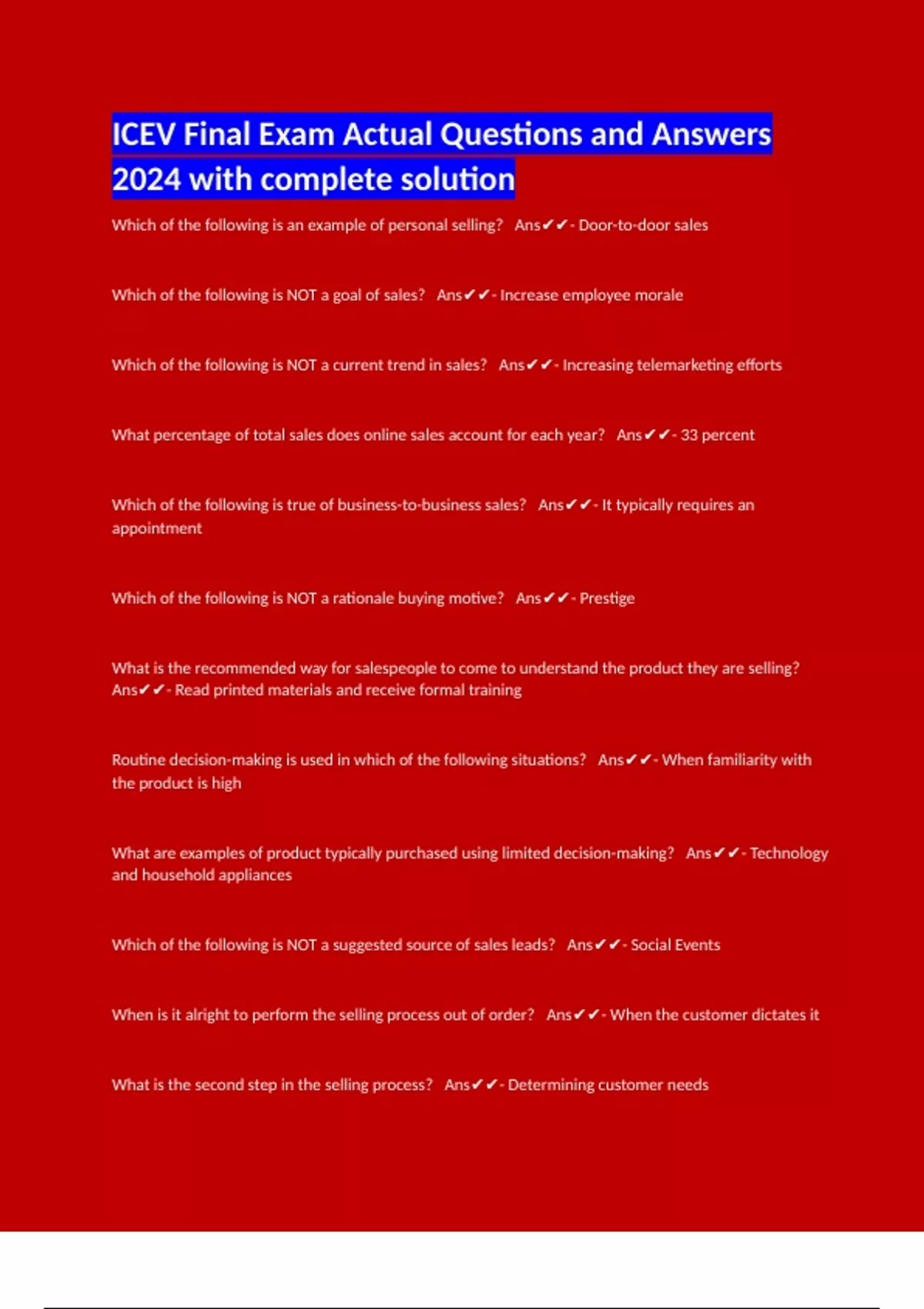 ICEV Final Exam Actual Questions and Answers 2024 with complete solution ICEV Elanco Vet Med Certification Exam Questions and Answers with complete solution Life Span Development- iCEV Lesson 1-9 Final Assessments- 1st Semester Exam 2024 Updated Questions and Answers Complete ICEV - Animal Science Certification Exam New Gen Questions and