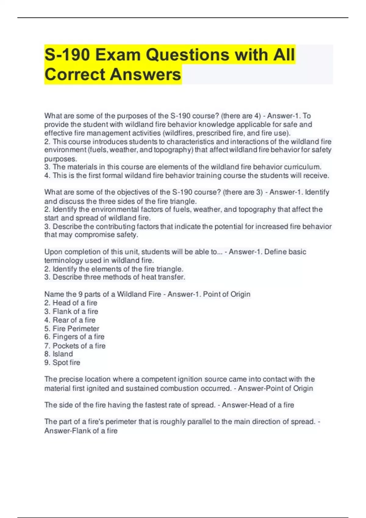 S-190 Practice Exam Questions with Correct Answers 2 Exam (elaborations) S-190 Module 3 Questions with All Correct Answers 3 Exam (elaborations) Wildland firefighting S-190 Exam Questions and Answers All Correct 4 Exam (elaborations) S-190 2024 Test with A Guarantee Pass 5 Exam (elaborations) S130 and S190 Exam Questions with Correct Answers 6