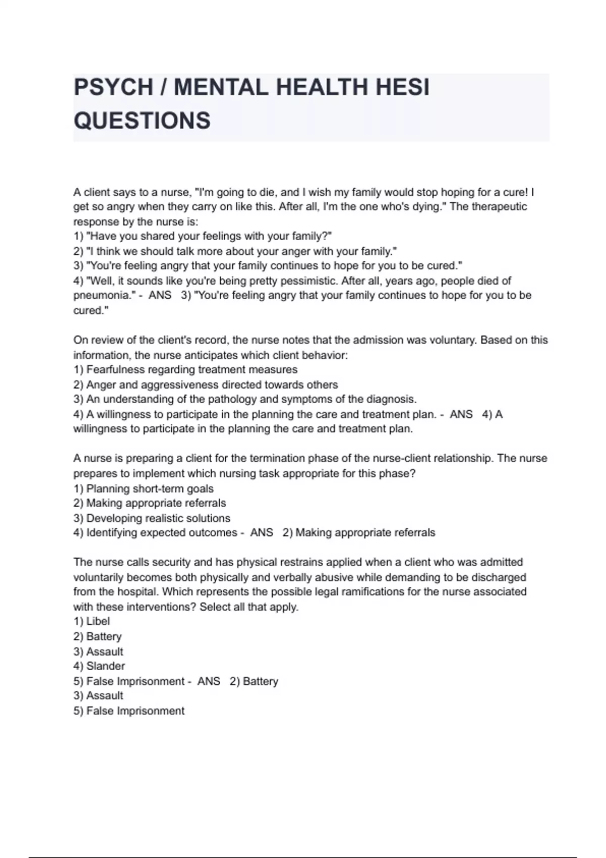 HESI Psychiatric/Mental Health Practice Test Exam Questions And Answers
