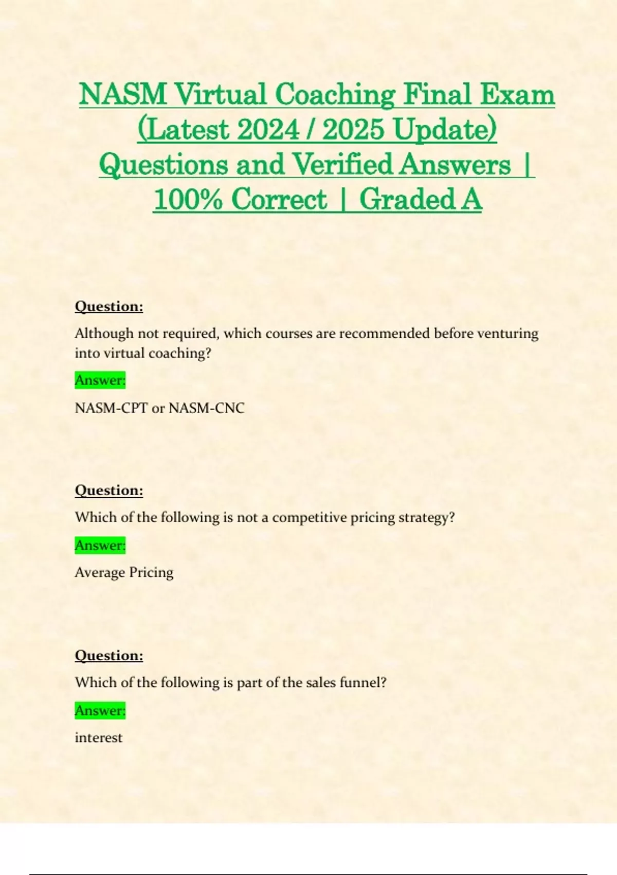 NASM Virtual Coaching Final Exams (Latest 2024 / 2025 Updates STUDY BUNDLE WITH COMPLETE SOLUTIONS) Questions and Verified Answers | 100% Correct | Grade A