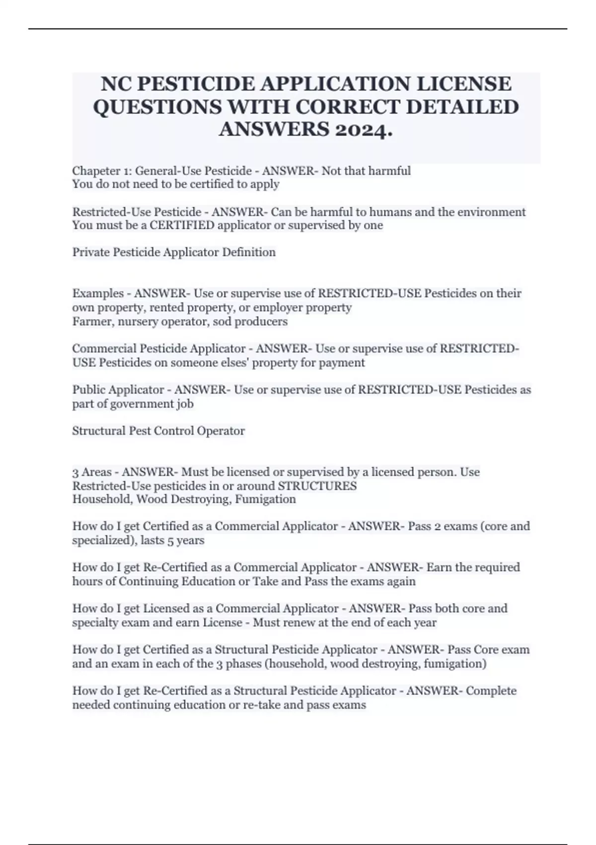 PESTICIDE LICENSE ORNAMENTAL AND TURF FOR NC QUESTIONS WITH CORRECT DETAILED ANSWERS NORTH CAROLINA PESTICIDE APPLICATOR CERTIFICATION CORE MANUAL (CH. 1-3) QUIZESS AND ANS.NC PESTICIDE APPLICATION LICENSE QUESTIONS WITH CORRECT DETAILED ANSWERS 2024 NC CORE & PRIVATE APPLICATOR PESTICIDE LICENSE EXAM QUESTIONS WITH CORRECT DETAILED ANSWERS