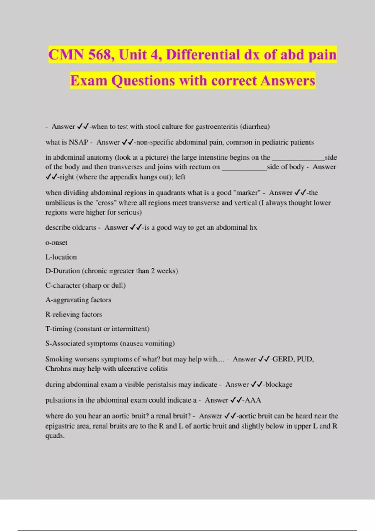 CMN 568, Unit 4, Differential dx of abd pain Exam Questions with correct Answers