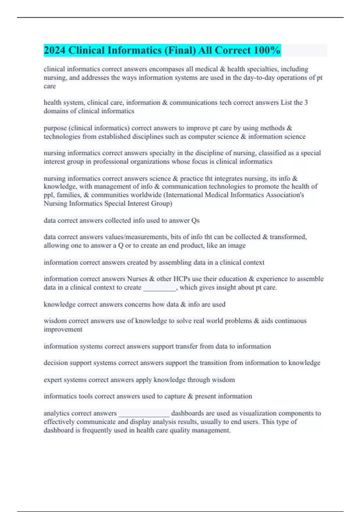 2024 Clinical Informatics (Final) All Correct 100% Siff Clinical Informatics Boards study set 1 (A+ Guaranteed) How Clinical Informatics Impacts Health Care Delivery (A+ Graded) Epic Clinical Informatician (100% Correct Answers) Clinical Informatics (A+ Graded Already) Clinical Informatics Quiz 1 (100% Correct Answers) Clinical Informatics Quiz 1 C