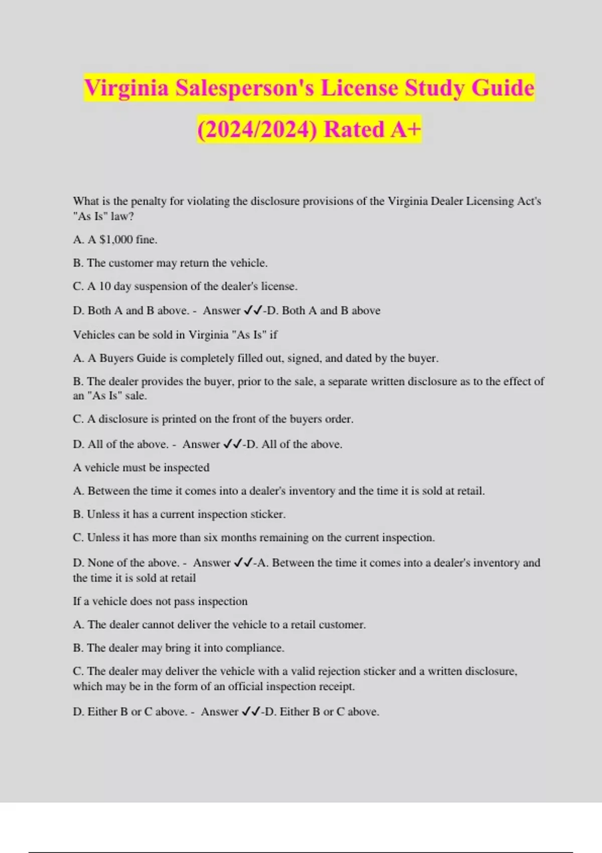 VA State Inspection Questions and Answers Rated A+