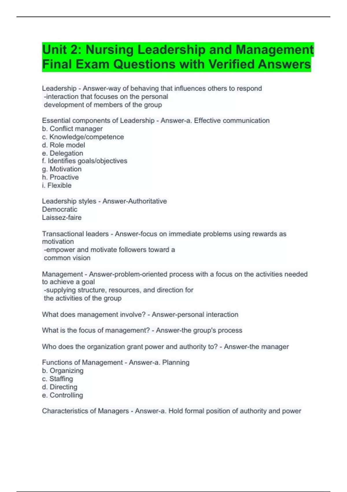 Test Banks Leadership and Management Exam Questions with Correct Answers