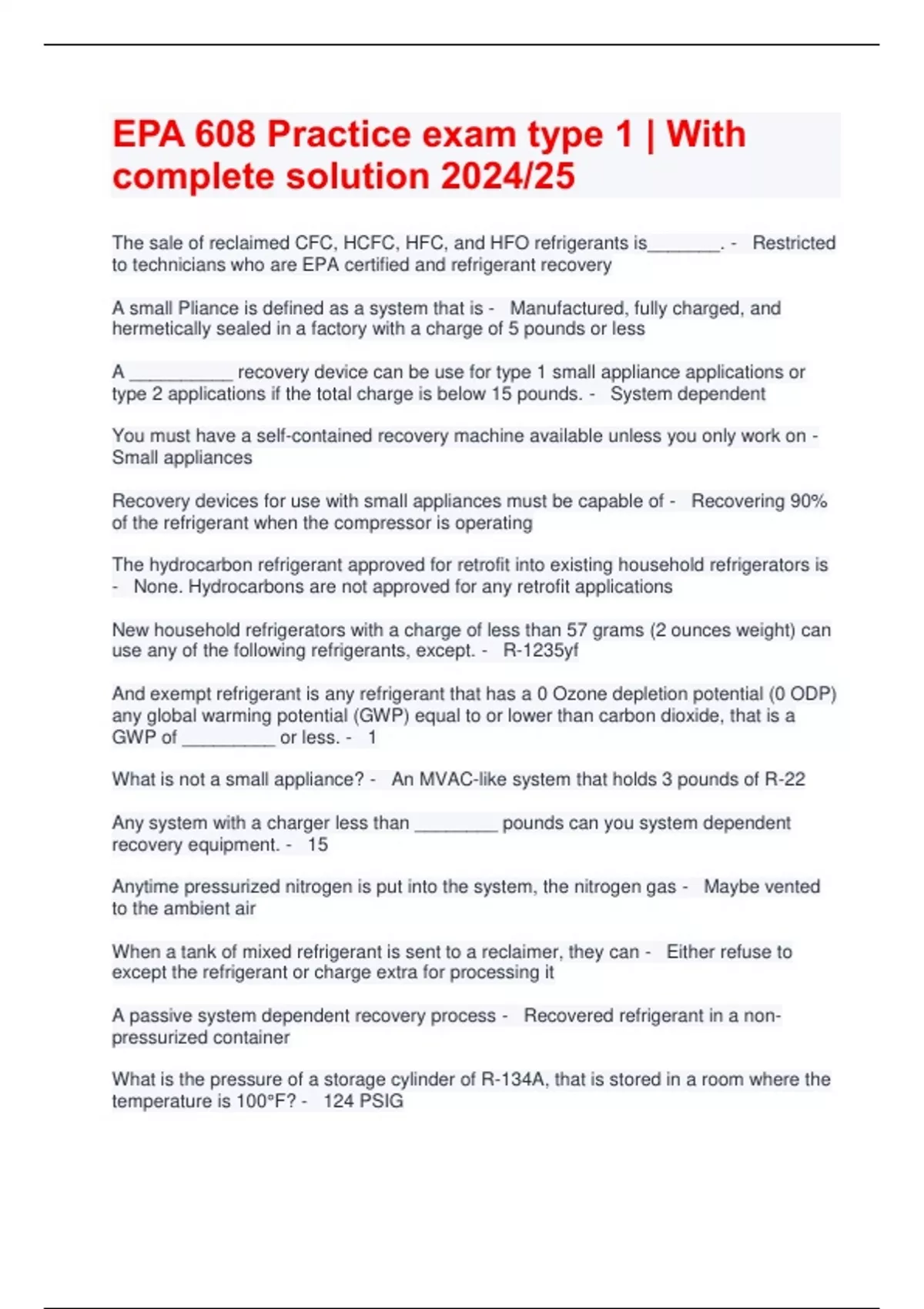 Exam (elaborations) EPA 608 Type 1 | With complete solution | Latest 2024/25 2 Exam (elaborations) EPA 608 Certification | UPDATED 2024/25 3 Exam (elaborations) EPA 608 Practice exam type 1 | With complete solution 2024/25
