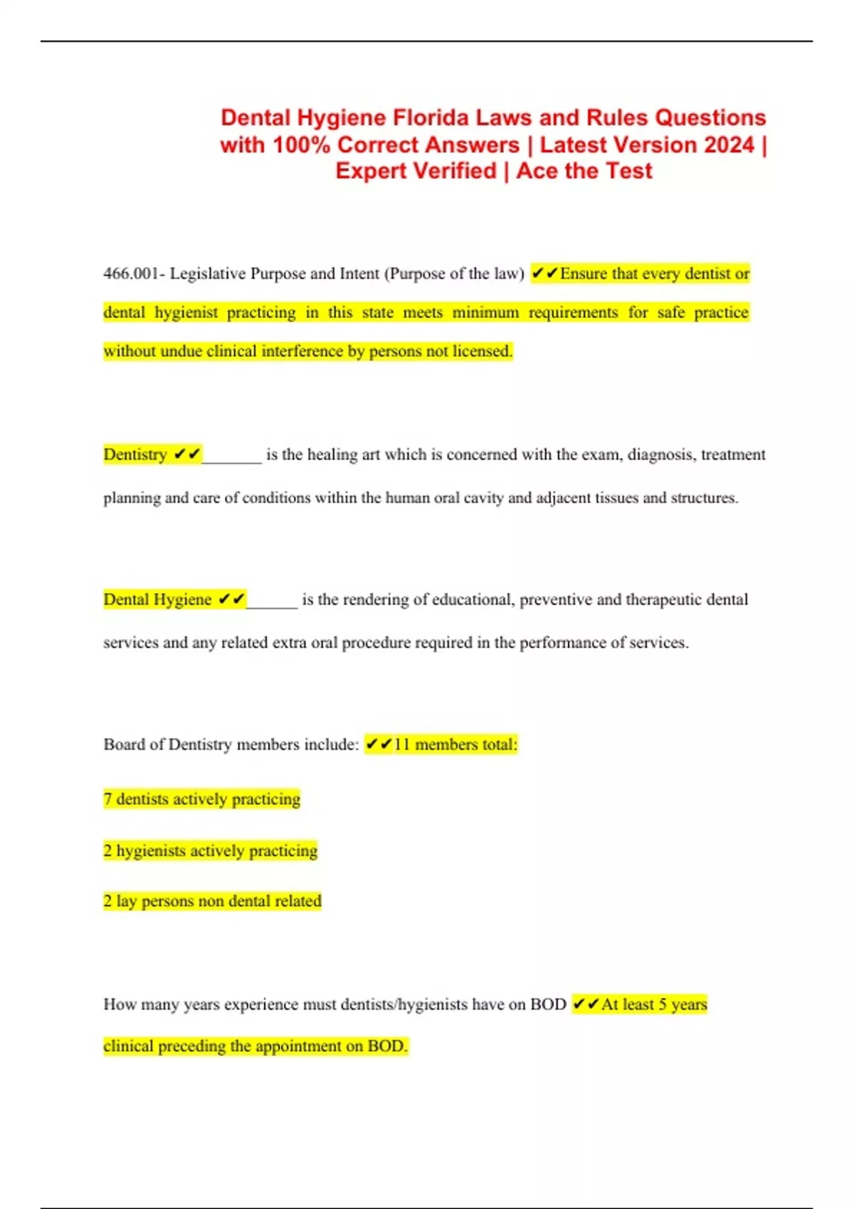Florida Dental Laws and Rules Bundled Exams with Complete Solution | Expert Verified 2024 | Guaranteed Success