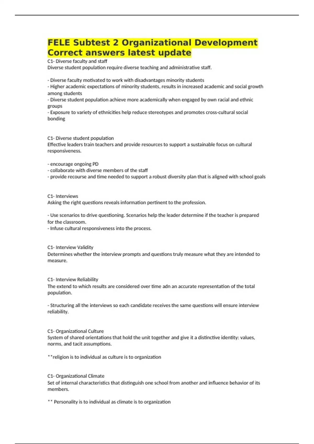 FELE Subtest 2 Organizational Development Correct answers latest update